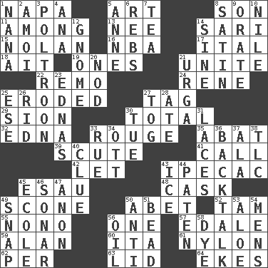 ACROSS 1. California wine valley 5. Nonscientific branch of learning 8. Male child 11. Amid 13. Born 14. Indian skirt 15. Pitcher Ryan 16. Basketball assoc. 17. Slanted text style (abbr.) 18. Small island 19. Washington bills 21. Join together 22. San ____ (Riviera town) 24. French philosopher Descartes 25. Eaten away 27. Label 29. The Jewish people; Israel 30. Add up to 32. Pulitzer Prize-winning author Ferber 33. Makeup applied to the cheeks 35. Blind as ____ 39. Scutum 41. Give a ring to 42. Allow 43. Medicinal drug used to evoke vomiting 45. Son of Isaac 48. Keg 49. Biscuitlike quick bread 50. Collude with 52. Scottish cap 55. Words to Nanette 56. Single 57. Peak District village in England 59. Actor Alda or Thicke 60. Call ___ day 61. Thermoplastic polyamide 62. For each 63. Flaplike covering 64. Supplements with great effort DOWN 1. Grandmother 2. Mine, in Marseilles 3. Coward 4. Santa ___, CA 5. Queen of England 1702-14 6. Confederate soldiers (slang) 7. Afternoon social gathering 8. Smooth fabric 9. Speak pompously 10. "Death on the ____" 12. Dwarf 14. Trig term 20. Lower and raise head in agreement 21. Capital and largest city of Mongolia 23. Ferber et al. 25. Compass dir. 26. To free from 27. Coat; cloak 28. Had dinner 30. Third day of the wk. 31. Shoestrings 33. Sorrow 34. Baseball player Mel 36. Sass 37. Wing 38. Affectionate concern, for short 40. A slight indication 43. Frozen water 44. Eucharist need 45. Learning spot: Fr. 46. Underwater navigation system 47. Soon (poet.) 49. Fastener 50. Against 51. Necklace unit 53. Medicinal plant 54. Not women's 56. Lubricate 58. Color