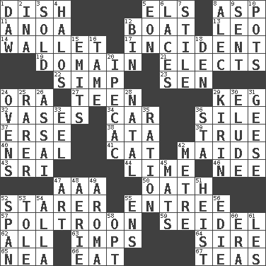ACROSS 1. Food container 5. Raised railways 8. Cleo's killer 11. Small Philippine buffalo 12. Water vessel 13. Lion 14. Place for singles 17. Happening 19. Kingdom 21. Opts 22. Simple or foolish person 23. Elected rep. 24. Mouth or opening 27. Adolescent 29. Cask 32. Flower holders 34. 4-wheeled motor vehicle 36. Filth; sediment 37. Celtic language 38. "One Day ___ Time" 39. Loyal 40. Be tempered by heat 41. Feline 42. Women servants 43. _ Lanka 44. Citrus frut 46. Born 47. American Automobile Association (abbr.) 50. Pledge 52. A viewer who gazes fixedly 55. Main course 57. Characterized by complete cowardliness 59. Beer mug 62. Everything 63. Naughty children 64. Title for a man of rank and authority 65. Teachers' org. 66. Ingest 67. Afternoon social gatherings DOWN 1. Obsolete 2. _ tizzy (2 wds.) 3. Disposed of to a purchaser 4. Rings 5. Period of immesurable duration 6. Shoestrings 7. Vertical member of a panel or frame 8. Actor Baldwin 9. Transmitted 10. Cooking vessels 12. Storage container 15. Gives off 16. Not wild 18. Lair 20. Medicinal drug used to evoke vomiting 24. Baking chambers 25. Less widely known 26. Slender Brazilian palm 28. Relating to or accompanying birth 29. Japanese brewing company 30. Evade 31. Honkers 33. Snakelike fish 35. Food allowance for one day 36. R.R. building 42. Distance measurement (Brit.) 45. Floor protectors 47. Nonscientific branch of learning 48. Nest on high 49. Scent 51. Robbery 52. Connect, as a bridge 53. Lacquered or enameled metalware 54. Silent film actress Nazimova 55. Followers of ems 56. Singer Brickell 58. Choose 60. Period 61. French article