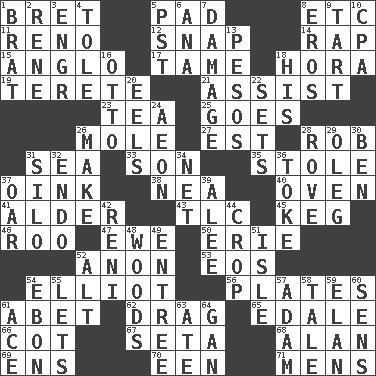 ACROSS 1. Cy Young winner Saberhagen 5. Groovy apt. 8. And so on (abbr.) 11. Western Nevada city 12. Fastener 14. Hit sharply and swiftly 15. White American of non-Hispanic descent 17. Not wild 18. Israeli folk dance 19. Cigar-shaped 21. Help 23. Afternoon social gathering 25. Leaves 26. Undercover agent 27. Eastern Standard Time (abbr.) 28. Director Reiner 31. Ocean 33. Male child 35. Took without asking 37. Pig sound 38. Teachers' org. 40. Baking chamber 41. Tree or shrub in the Birch family 43. Affectionate concern, for short 45. Cask 46. Friend of Pooh 47. She-sheep 50. One of the Great Lakes 52. At once, immediately (arch.) 53. Greek goddess of the dawn 54. American author Paul (1891-1958) 56. Food holders 61. Collude with 62. To be drawn or hauled along 65. Peak District village in England 66. Small bed 67. Bristle 68. Actor Alda or Thicke 69. Followers of ems 70. Car or cant ending 71. Not women's DOWN 1. Naughty child 2. French philosopher Descartes 3. Engineer (abbr.) 4. Lacquered or enameled metalware 5. Pacific Standard Time (abbr.) 6. Santa ___, CA 7. Break 8. Greek god of love 9. Small pie 10. Numbers guy (abbr.) 13. Mexican monetary units 16. Von Bismarck 18. Part of HMS, perhaps 20. Snakelike fish 22. Puts into a specified state 24. A really long time 26. Cause to be 28. Be footloose 29. Cassini of fashion 30. Benjamin's nick name 31. Grain storage tower 32. Inside; within (prefix) 34. Fish or hair follower 36. Puff or smoke 37. Boat paddle 39. Toward shelter 42. Painter Guido (1575-1642) 44. Riding implement 48. Forest 49. Main course 51. Capri or Wight 52. Keyboard modifier key 54. Inky black, to poets 55. Allows 57. First man 58. Falsehood 59. Flair 60. Elected reps. 61. Adept person 63. Had dinner 64. Separate the seeds from cotton