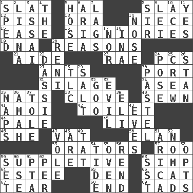 ACROSS 1. Narrow board 5. Actor Linden 8. Kill 12. Expression of disdain 13. Mouth or opening 14. Sibling's daughter 15. Comfort 16. Seigniories (variant) 19. Heredity factor (abbr.) 20. Thinks logically 21. Assistant 23. Actress Charlotte 24. Personal Computers (abbr.) 27. Pismires 30. Sweet dark-red dessert wine 31. Fodder prepared in a silo 34. Toward the sea 35. Floor coverings 38. Garlic unit 40. Stitched 41. Mine, in Marseilles 42. Rest room 44. Diluted with white 45. Moving, as bait 46. A female animal or person 47. Large container 50. Liveliness 53. Speakers 57. Friend of Pooh 59. Supplying deficiencies 63. Simple or foolish person 64. First name in cosmetics 65. Lair 66. Scram! 67. Rend 68. Conclude 69. Bits DOWN 1. Moved rapidly 2. Woody, climbing, usually tropical plant 3. Slender Brazilian palm 4. Definite Article 5. Stockings 6. Operatic vocal solo 7. Fails to keep up a pace 8. Title for a knight 9. Flowery wreath 10. Adept person 11. Consenting reply 14. Olfactory organ 17. And not 18. _ tizzy (2 wds.) 20. Painter Guido (1575-1642) 22. Small ungulate mammals of Africa 24. Airs 25. Ship's personnel 26. Comedian Laurel of Laurel & Hardy 28. Affectionate concern, for short 29. Table seasoning 30. Soft color 32. Thick or sticky substance 33. Tending to cause great harm 35. Atlas contents 36. Nursemaid 37. Lacquered or enameled metalware 39. Connecticut Ivy Leaguer 43. Nights before holidays 47. Grand slam 48. "We ___ not amused" (Victoria) 49. Make lace 51. N. Chile seaport 52. Wanderer 54. Event that recurs at intervals 55. Baking chamber 56. Tear apart 58. Elects 59. Arrange properly for use 60. Purpose 61. Parent Teacher Assoc. 62. For each 63. Fast jet (abbr.)