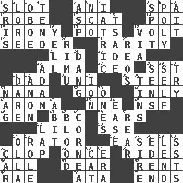 ACROSS 1. Narrow, elongated depression 5. Cuckoo 8. Health resort 11. Loose flowing garment 12. Scram, to a cat 14. Luau course 15. Literary sarcasm 17. Cooking vessels 18. Electrical Unit 19. Sowing specialist 21. Noteworthy scarcity 23. Flaplike covering 25. The main thing one is thinking about 26. _ mater 27. Corporate head (abbr.) 28. Fast jet (abbr.) 31. Male parent 33. Corn or form start 35. Guide 37. Nanny 38. Thick or sticky substance 40. Inwardly 41. Odor 43. Compass dir. 45. Overdraft (abbr.) 46. Commissioned mil. rank 47. English channel? 50. Hearing organs 52. _ and Stitch 53. Compass dir. 54. Speaker 56. Artist's stands 61. Hoof sound 62. At one time in the past 65. Amusement-park features 66. 100% 67. Letter starter 68. Monthly bill 69. Actress Charlotte 70. _ moment's notice (2 wds.) 71. Extremities DOWN 1. Indian titles of respect 2. Old wives' tales, e.g. 3. Mitch Miller's instrument 4. Be inclined (to) 5. Viper 6. Non-commissioned officer (abbr.) 7. Of or pertaining to medicine 8. Specific locale 9. Much (prefix) 10. Small island 13. Sadhe (variant) 16. Shout 18. By way of 20. Tall New Zealand timber tree 22. Vintage cars 24. Mild oath, euphamism for damn 26. First of billions? 28. Elected reps. 29. Oneself 30. Attempt 31. Have the gumption 32. At once, immediately (arch.) 34. Electrically charged atom 36. Canisters 37. Tired old horse 39. Washington bills 42. "This won't hurt ____!" 44. Comfort 48. Vital fluid 49. Pupil covering 51. Posterior 52. Pet locale 54. Water jar 55. Hero or heavy, e.g. 57. Beget 58. Genesis locale 59. Grant temporary use of 60. Fast planes 61. Automobile 63. Domesticated feline 64. Epoch