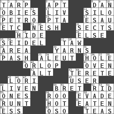 ACROSS 1. Canvas cover 5. Fitting 8. One of the 12 tribes of Israel 11. Off-Broadway awards 13. 54 in ancient Rome 14. Grain storage tower 15. Stone: prefix 16. Parent Teacher Assoc. 17. Son of Isaac 18. And so on (abbr.) 19. Tender 21. Religious groups 22. Flintstone garb 24. Otherwise 25. A glass for beer 27. The 23rd letter of the Hebrew alphabet 29. Type of rug 30. Tall tales 32. Romantic infatuation 33. Native American of Southwest Alaska 35. Hollow 39. Lowest deck of a ship 41. Baking chamber 42. The first octave above the treble staff 43. Cigar-shaped 45. Australian parrot (variant) 48. One who makes use of a thing 49. Make or become more lively 50. Cy Young winner Saberhagen 52. To free from 55. Singles 56. Friend of Pooh 57. Dodge 59. The smallest animal of a litter 60. Being at a high temperature 61. Ingested 62. Curvy letter 63. Bear (Spanish) 64. Afternoon social gatherings DOWN 1. Drink excessively 2. Collude with 3. Actors Guy, Robert Welles, and Clint 4. For each 5. High mountains 6. Essential or central part 7. Federal power corp. 8. Plates 9. Having winglike extensions 10. Horse sense 12. Something which is sent 14. Sew up the eyelids of hawks and falcons 20. Snakelike fish 21. Stitched 23. Potato state 25. Plant excrement 26. Period 27. The 19th letter of the Greek alphabet 28. Tate display 30. Slangy assent 31. Dinah or Pauly 33. 100% 34. Car dealer's back yard 36. Make much ado about nothing 37. Allow 38. Compass dir. 40. Water falling in drops from the sky 43. Third day of the wk. 44. First name in cosmetics 45. "_ and Lucy" (Charlie Brown theme song) 46. Baking chambers 47. Repose 49. Old wives' tales, e.g. 50. Scornful sounds 51. Printing process, for short 53. The main thing one is thinking about 54. Cub Scout units 56. 17th letter of the Greek alphabet 58. Large container