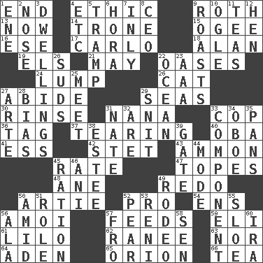 ACROSS 1. Conclusion 4. Principle of right and wrong 9. Writer of Portnoy's Complaint (1969) 13. Immediately 14. Marketplace scale 15. Double curve, resembling the letter S 16. Compass dir. 17. Monte _, Las Vegas Hotel/Casino 18. Actor Alda or Thicke 19. Raised railways 21. Fifth month 22. Fertile tracts in a desert 24. Mass 26. Domesticated feline 27. Stay 29. Oceans 30. Wash lightly 31. Nanny 33. Police officer (slang) 36. Label 37. Lacerating 40. Chief or king in Benin or Nigeria 41. Curvy letter 42. Proofreading order 43. ID or VA city 45. Assign a rank or rating to 47. Drinks excessively 48. A saturated hydrocarbon 49. Make new 50. Nick name for Arthur 52. Adept person 54. Followers of ems 56. Mine, in Marseilles 57. Eats 59. Biblical high priest 61. _ and Stitch 62. Indian princess (variant) 63. And not 64. Arabian gulf 65. Constellation of myth 66. Afternoon social gathering DOWN 1. Compass dir. 2. Sense of smell 3. Residences 4. And so on (abbr.) 5. _____ steamer (cargo ship) 6. Israeli folk dance 7. In an inward manner 8. Corporate head (abbr.) 9. Cooks with dry heat, as in an oven 10. Stare at amorously 11. Afternoon social gatherings 12. Layer 20. Beer foam 22. Sea 23. Auto club (abbr.) 25. Rendezvous 27. Johnson of "Laugh-In" 28. Prejudice 29. In a ____ (agitated or irritated) 31. Nathan's nickname 32. "We ___ not amused" (Victoria) 33. Part 34. Mitch Miller's instrument 35. Zero-star reviews 38. First name in cosmetics 39. Yard entry 44. Method 45. Food allowance for one day 46. Black tropical American cuckoo 49. Cowboy competition 50. Among 51. Hero or heavy, e.g. 52. Lightbulb-shaped fruit 53. Painter Guido (1575-1642) 55. A type of plum 56. According to 57. Back 58. Elected rep. 60. Lyricist Gershwin