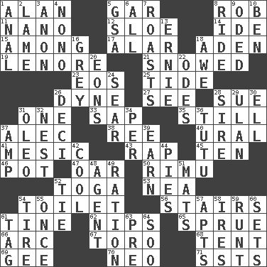 ACROSS 1. ____ Jay Lerner 5. Slender fish 8. Director Reiner 11. Billionth: prefix 12. _ gin 14. Binary compound 15. Amid 17. Having or resembling wings 18. An important port of Yemen 19. Poe poem 21. Frozen precipiation fell 23. Greek goddess of the dawn 25. Event that recurs at intervals 26. Centimeter-gram-second unit of force 27. Perceive with the eye 28. Take to court 31. Single 33. Plant excrement 35. Not moving 37. Actor Baldwin 38. To riddle 40. Mountain range 41. Mesonic 43. Hit sharply and swiftly 45. Nine, plus one 46. Plant holder 47. Boat paddle 50. Tall New Zealand timber tree 52. Ancient Roman robe 53. Teachers' org. 54. Bathroom plumbing fixture 56. Flight of steps 61. Prong on a fork 62. Cuts off 65. Upset 66. Curve 67. "Corrida" creature 68. Portable shelter 69. Turn to the right 70. Modern: prefix 71. Fast planes DOWN 1. Of or related to the anus 2. Unable to walk 3. At once, immediately (arch.) 4. Words to Nanette 5. Girls' org. (abbr.) 6. 100% 7. Exposes to great heat 8. Travel on an animal 9. Wrote a lyric poem 10. Benjamin's nick name 13. Bert's buddy 16. Jennifer or Joel 18. Deep reverence 20. Immeasurably long periods of time 22. Lyric poems 24. Wither 26. Tenth: prefix 28. Title for a man of rank and authority 29. ____ Bator 30. Pipe bend 31. Butter sub 32. A home for chicks 34. For each 36. Ballerina skirt 37. Electrical Unit 39. Merit 42. Calm and collected 44. Sliced desserts 48. Rep 49. Food allowance for one day 51. Floor protectors 52. Neckwear 54. Hoop that covers a wheel 55. Single time 57. Flats, for short 58. Angers 59. Undersized animal 60. Arranges properly for use 61. Label 63. Before (prefix) 64. "Barney Miller" actor Jack
