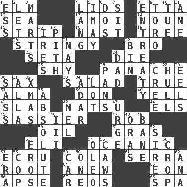 ACROSS 1. Shade tree 4. Hats (slang) 8. Singer James 12. Ocean 13. Mine, in Marseilles 14. Part of speech 15. Empty completely 18. Political cartoonist Thomas 19. Relationship diagram 20. Slender, wiry 22. Sis' sibling 23. Stalk of a moss capsule 24. Expire 25. Like a shrinking violet 26. Flamboyance 30. Saxophone 33. Vegetable dish 36. Loyal 37. _ mater 39. Spanish title 40. Shout 41. Broad, flat, thick piece 42. Taiwanese island in East China Sea 44. Raised railways 45. More lively and spirited 47. Director Reiner 50. Petroleum 51. Pate de foie ____ 53. Connecticut Ivy Leaguer 54. Pertaining to the sea 57. Shade of tan 59. Root beer relative 61. Father Junipero _ 63. Carrot, for example 64. Afresh 65. A really long time 66. Domed church section 67. Vintage cars 68. Health resort DOWN 1. Double-curved letter 2. Allows 3. Shops 4. Austrian-born American filmmaker Fritz 5. "If ____ say so..." 6. Two (Sp.) 7. Be seated 8. Plea 9. "Corrida" creature 10. Third day of the wk. 11. A saturated hydrocarbon 16. Angers 17. Heart or essence 21. Negative votes 22. Storage container 24. Male parent 26. Baking dishes 27. Algonquian 28. Frame or body of a ship 29. Snakelike fish 30. Backtalk 31. Silent film actress Nazimova 32. Dec. holiday 34. The sixth month of the Jewish calendar 35. Car dealer's back yard 38. Utter; complete 42. Cartoonist voice _ Blanc 43. Goad 46. One more than two 48. Mouths or openings 49. Object of repulsion 52. Fathers 53. Greek god of love 54. Margarine 55. Crow sounds 56. Riding implement 57. Period 58. Police officer (slang) 59. Auto 60. Single 62. Santa ___, CA