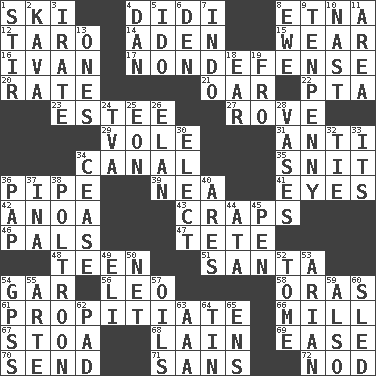 ACROSS 1. What Jean-Claude Killy likes to do 4. "You Light Up My Life" star Conn 8. Inactive volcano in Sicily 12. Edible starchy tuberous root 14. An important port of Yemen 15. Put on (as clothing) 16. _ the terrible 17. Unrelated to defense, as in spending 20. Assign a rank or rating to 21. Boat paddle 22. Parent Teacher Assoc. 23. First name in cosmetics 27. Be footloose 29. Short-tailed, large-bodied rat 31. Against 34. Lessep's creation 35. In a ____ (agitated or irritated) 36. Corncob 39. Teachers' org. 41. Snake ____ (dice throw) 42. Small Philippine buffalo 43. Dice game 46. Friends 47. Wig 48. Adolescent 51. Before Barbara or Clara 54. Slender fish 56. Lion 58. Mouths or openings 61. Conciliate 66. Place where flour is made 67. Portico 68. (Had) reclined 69. Comfort 70. Transmit 71. Without 72. Dreamland DOWN 1. Agitate 2. Polynesian shrub of the pepper family 3. Feeling or showing extreme anger 4. Daniel's nick name 5. Wedding promise 6. Lair 7. Southeast Asian peninsula 8. She-sheep 9. 3-inch nail 10. Political cartoonist Thomas 11. Type of rug 13. Singles 18. Hearing organ 19. Back 24. Federal power corp. 25. A really long time 26. Style 28. Flower holders 30. Voters do this 32. Make a knot 33. It is 34. Stop 36. Infant food 37. _ tizzy (2 wds.) 38. Coward 40. Ancient Greek god of war 44. "One Day ___ Time" 45. Fenced enclosure 49. Connecticut Ivy Leaguer 50. Remaining after all deductions 52. Heavy book 53. Believer in; advocate of (suffix) 54. Global Positioning Systems (abbr.) 55. Johnson of "Laugh-In" 57. Lubricates 59. In addition 60. Downhill vehicle 62. Groovy apt. 63. American Automobile Association (abbr.) 64. Shallow baking pan 65. Followers of ems