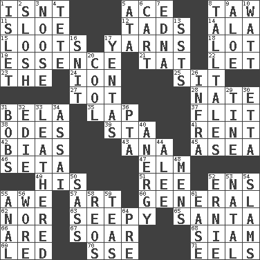 ACROSS 1. Is not 5. Adept person 8. The 23rd letter of the Hebrew alphabet 11. _ gin 12. Small boys 14. Wing 15. Plunders 17. Tall tales 18. Car dealer's back yard 19. Substance 21. Make lace 22. Allow 23. Definite Article 24. Electrically charged atom 25. Be seated 27. Small child 28. Nathan's nickname 31. Actor Lugosi 35. Pet locale 37. Sudden quick movement 38. Lyric poems 39. R.R. building 41. Monthly bill 42. Prejudice 43. Santa ___, CA 45. Toward the sea 46. Bristle 47. Shade tree 49. Part of HMS, perhaps 51. Portuguese money of account (variant) 52. Followers of ems 55. Deep reverence 57. Tate display 60. Commissioned military rank 62. Not either 63. Oozy 65. Before Barbara or Clara 66. "We ___ not amused" (Victoria) 67. Fly high 68. Thailand, formerly 69. Directed 70. Compass dir. 71. Snakelike fish DOWN 1. Small island 2. Splash clumsily 3. Trap for birds or small mammals 4. Wig 5. _ moment's notice (2 wds.) 6. Haul 7. Pulitzer Prize-winning author Ferber 8. Baron Munchausen's specialties 9. _ vera 10. Electrical Unit 13. Fast planes 16. In a ____ (agitated or irritated) 17. Gossips 20. Calm and collected 26. Kind of red light 29. Prong on a fork 30. Singer James 31. Moves up and down 32. Singer Brickell 33. Resembling or made to resemble leather 34. Slender Brazilian palm 36. Parent Teacher Association (abbr.) 40. Disorder of the immune system 44. Toward shelter 48. Not women's 50. Backtalk 52. Bert's buddy 53. Brizilian seaport 54. Hits or strikes with great force 55. Of or related to the anus 56. Had on 58. Vintage cars 59. Beverages made from leaves 61. Comfort 64. Before (prefix)