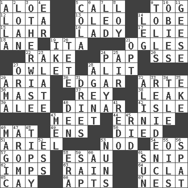 ACROSS 1. Medicinal plant 5. Give a ring to 9. Coat; cloak 12. Globular water bottle used in Asia 13. Butter sub 14. Ear part 15. Cowardly lion portrayer 16. Kenny Rogers chart-topper in '80 17. Writer Wiesel 18. A saturated hydrocarbon 19. Call ___ day 21. Stares 22. Libertine 24. Infant food 26. Compass dir. 27. A small or young owl 28. Came down and settled, as after flight 29. Roberta Peters solo 30. _ Allan Poe 32. Johnson of "Laugh-In" 36. Vertical spar for supporting sails 37. Marina Del _, California 38. Path through which fluid escapes 39. Toward shelter 40. Middle Eastern gold or silver currency 42. Small island 43. Confront 44. Bert's buddy 46. Floor covering 49. Followers of ems 50. Passed on 51. Satellite of Uranus 53. Dreamland 54. Greek goddess of the dawn 57. Republicans 58. Son of Isaac 61. Sever or remove by pinching or nipping 62. Naughty children 63. Precipitation 64. Southern CA. univ. 65. Island 66. Tenement units (abbr.) 67. Egg locale DOWN 1. Silent film actress Nazimova 2. Grant temporary use of 3. Else 4. Ewer handle 5. Root beer relative 6. Chicken ___ king 7. Directed 8. Myrna of the movies 9. For Whom the Bell _____ 10. Off-Broadway awards 11. Honkers 14. Part of a journey 19. Eisenhower's nickname 20. False hair 21. Choose 23. Having winglike extensions 24. Beach, in Buenos Aires 25. Atmosphere 27. Taken by mouth 28. Representative 29. Nanny (var.) 31. Frees from moisture 32. Place in a line 33. Home 34. Lie 35. Make supply last 40. Lair 41. Make new 43. Cartoonist voice _ Blanc 45. To free from 46. Mysterious quality of enchantment 47. Odor 48. Likely to tip or tilt 52. Curvy letter 53. Religious women 55. Lubricates 56. Argument over a trivial matter 58. Epoch 59. Plant excrement 60. Small island 61. Player for Phoenix