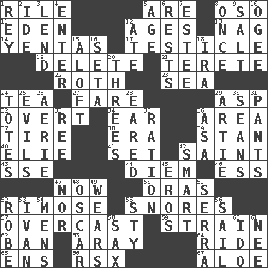 ACROSS 1. Cause heat under the collar 5. "We ___ not amused" (Victoria) 8. Bear (Spanish) 11. Genesis locale 12. Ripens 13. Tired old horse 14. Gossips 17. A testis 19. Keyboard key 21. Cigar-shaped 22. Writer of Portnoy's Complaint (1969) 23. Ocean 24. Beverage made from leaves 27. Conductor's collection 29. Viper 32. Unconcealed 34. Ewer handle 36. Length times width 37. Become fatigued 38. Period 39. Comedian Laurel of Laurel & Hardy 40. Writer Wiesel 41. Arrange properly for use 42. Inhabitant of Heaven 43. Compass dir. 44. South Vietnam president (1954) 46. Curvy letter 47. Immediately 50. Mouths or openings 52. Full of chinks, cracks, or crevices 55. Sounds asleep 57. Cloudy 59. Put through a sieve 62. Bar 63. Like ___ of sunshine 64. Travel on or in a vehicle 65. Followers of ems 66. Acura sports coupe 67. Medicinal plant DOWN 1. Marina Del _, California 2. Binary compound 3. Grant temporary use of 4. Keyboard key 5. Grow older 6. Musical pauses 7. First name in cosmetics 8. At one time in the past 9. Table seasoning 10. Double curve, resembling the letter S 12. Had dinner 15. Upward 16. Bristle 18. Lyricist Gershwin 20. Triplets 24. Hauls 25. Vices 26. Nest on high 28. Having ears or earlike features 29. Nick name for Arthur 30. Actors Connery and Penn 31. Leg coverings 33. To separate or throw off 35. Food allowance for one day 36. White ___ sheet 42. Don Adams' spy role 45. Greek god of love 47. And not 48. Motion picture award 49. Puts on (as clothing) 51. Father Junipero _ 52. Loose flowing garment 53. "Terrible" tsar 54. Not women's 55. Filthy place 56. Travel by water 58. Saxophone 60. Wedding promise 61. Born