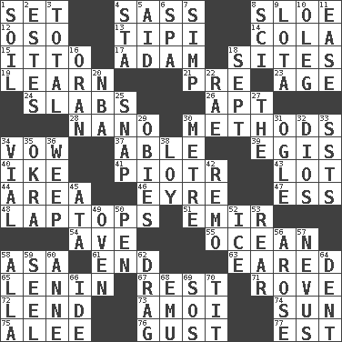 ACROSS 1. Put into a specified state 4. Backtalk 8. _ gin 12. Bear (Spanish) 13. Native american tent (variation) 14. Root beer relative 15. "Tell ____ the Marines!" 17. First man 18. Locates 19. Acquire or gain knowledge or skills 21. Before (prefix) 23. Ripen 24. Broad, flat, thick pieces 26. Fitting 28. Billionth: prefix 30. Modes 34. Solemn pledge 37. Competent 39. Armor plate that protects the chest 40. Eisenhower's nickname 41. Peter (Polish) 43. Car dealer's back yard 44. Length times width 46. Jane of fiction 47. Curvy letter 48. Portable computers 51. Arab leader 54. "___ Maria" 55. Sea 58. White ___ sheet 61. Conclusion 63. Having ears or earlike features 65. Soviet premier 1918-24 67. Respite 71. Be footloose 72. Grant temporary use of 73. Mine, in Marseilles 74. Player for Phoenix 75. Toward shelter 76. Abrupt rush of wind 77. Eastern Standard Time (abbr.) DOWN 1. Earth 2. _____ Park, CO 3. Add up to 4. R.R. building 5. Assist 6. Health resort 7. Simple or foolish person 8. _-fi 9. Globular water bottle used in Asia 10. Cassini of fashion 11. Relaxation 16. NW Algerian seaport 18. Back-to-school mo. 20. Basketball assoc. 22. Actress Charlotte 25. Fastener 27. Definite Article 29. Off-Broadway awards 30. Distance measurement (Brit.) 31. Stare at amorously 32. "Vaya con ____" 33. Fast planes 34. Small bottle 35. Gumbo ingredient 36. Shed a tear 38. Myrna of the movies 42. San ____ (Riviera town) 45. _ moment's notice (2 wds.) 49. Baking chamber 50. Writing instrument 52. Frozen water 53. Hitchcock's "____ Window" 56. Came up 57. Mole, birthmark 58. Silent film actress Nazimova 59. Stitch closed the eyes of (a falcon) 60. Singer Murray 62. To draw with force 64. Undesirable depression on a surface 66. Binary compound 68. Australian flightless bird 69. Distress signal 70. Teat (slang)