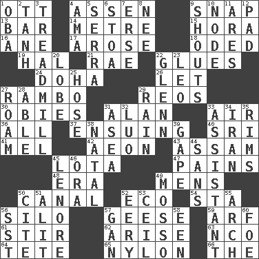 ACROSS 1. Baseball player Mel 4. NE Netherlands city 9. Fastener 13. Oblong piece of solid material 14. Distance measurement (Brit.) 15. Israeli folk dance 16. A saturated hydrocarbon 17. Came up 18. Wrote a lyric poem 19. Actor Linden 21. Actress Charlotte 22. Adhesives 24. Capital of the state of Qatar 26. Allow 27. Role for Stallone 29. Vintage cars 30. Off-Broadway awards 31. ____ Jay Lerner 33. Atmosphere 36. 100% 37. Following as a consequence or result 40. _ Lanka 41. Cartoonist voice _ Blanc 42. Period of immesurable duration 43. Indian state 45. Globular water bottle used in Asia 47. Aches 48. Period 49. Not women's 50. Lessep's creation 52. Environmental prefix 54. R.R. building 56. Grain storage tower 57. Honkers 59. Sandy's bark 61. Disorderly outburst 62. Ascend 63. Non-commissioned officer (abbr.) 64. Wig 65. Thermoplastic polyamide 66. Definite Article DOWN 1. Chief or king in Benin or Nigeria 2. Hyperbolic tangent 3. Excercise machine 4. Nanny (var.) 5. Spanish missionary in California 6. Portico 7. Celtic language 8. Born 9. Yells 10. Thickened enlargement 11. Ancient Greek god of war 12. Groovy apt. 20. Ear part 22. American astronaut and politician John 23. Lion 25. Stockings 27. Wander aimlessly 28. Competent 29. Precipitation 31. Toward the sea 32. Nilotic language 33. Aide 34. SW Asia republic 35. Basketball hoops 38. Brizilian seaport 39. Open wide 44. Without 45. Poe poem 46. Mouth or opening 49. With motion or animation 50. Quote 51. Came down and settled, as after flight 52. Suggestive of the supernatural 53. To provide with a ceiling 55. Bowlike part 56. Fast jet (abbr.) 57. Separate the seeds from cotton 58. Car or cant ending 60. Enemy
