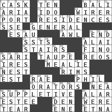 ACROSS 1. Keg 5. Nine, plus one 8. Indonesian resort city 12. Roberta Peters solo 13. Wedding promise 14. One who wires 15. Left side of a ship or aircraft 16. Homes 19. Compass dir. 20. Commissioned military rank 21. Son of Isaac 23. Leather borer 24. Conclude 27. Fast planes 30. Jai _ 31. Flight of steps 34. Fine (Spanish) 35. Indian skirt 38. Grayish beige 40. Vintage cars 41. Angers 42. Ear of corn 44. A home for chicks 45. Basketball hoops 46. Eastern Standard Time (abbr.) 47. Actress Charlotte 50. Silvers or Donahue 53. Speakers 57. Teachers' org. 59. Supplying deficiencies 63. Having or resembling wings 64. First name in cosmetics 65. Lair 66. We are 67. Separate forcefully 68. Compass dir. 69. Inactive volcano in Sicily DOWN 1. Smile enhancers 2. Came up 3. Founders of families 4. Krazy ___ of comics 5. Become fatigued 6. Paradise 7. Sense of smell 8. Storage container 9. Curve 10. Area sheltered from the wind 11. Big collection agency 14. Not ill 17. Lyricist Gershwin 18. Fool 20. Abrupt rush of wind 22. Help 24. Writer Wiesel 25. Billionth: prefix 26. "Vaya con ____" 28. Make lace 29. Thailand, formerly 30. Anew 32. Sorrow 33. Practice fight 35. Trig term 36. Ancient Greek god of war 37. Take ten 39. Biblical high priest 43. Naughty children 47. Hero or heavy, e.g. 48. "We ___ not amused" (Victoria) 49. Ingest 51. An arm off of a larger body of water 52. Memorize 54. Event that recurs at intervals 55. Baking chamber 56. French philosopher Descartes 58. Type of rug 59. Arrange properly for use 60. Purpose 61. Parent Teacher Assoc. 62. For each 63. Deep reverence