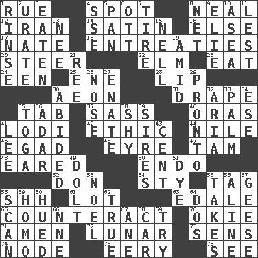 ACROSS 1. Sorrow 4. Specific locale 8. Actress Patricia 12. SW Asia republic 14. Smooth fabric 16. Otherwise 17. Nathan's nickname 18. Pleas 20. Bull 22. Shade tree 23. Consume 24. Car or cant ending 25. Compass dir. 28. Mouth edge 30. Period of immesurable duration 31. Window treatment 35. Bar bill 37. Backtalk 40. Mouths or openings 41. Farming town in central California 42. Value system 44. The longest river in the world 45. Mild oath 46. Jane of fiction 47. Scottish cap 48. Having ears or earlike features 50. Inside; within (prefix) 52. Spanish title 54. Filthy place 55. Label 58. Quiet! 61. Car dealer's back yard 63. Peak District village in England 65. Act in opposition 70. Migrant worker of the '30s 71. So be it 72. Type of eclipse 73. Elected reps. 74. Connecting point 75. Suggestive of the supernatural 76. Perceive with the eye DOWN 1. Wash lightly 2. A salt of uric acid 3. Eroded 4. Compass dir. 5. Baking dish 6. Baseball player Mel 7. Become fatigued 8. Remaining after all deductions 9. Writer Wiesel 10. At sea 11. For fear that 13. Born 15. 1994 drama film starring Jodie Foster 19. Among 21. To sift 26. Sense of smell 27. Maternal 29. Right away 30. Stayed 32. Operatic vocal solo 33. Inside of hand 34. Compass dir. 35. Ancient Roman robe 36. The sixth month of the Jewish calendar 38. Like a shrinking violet 39. Founders of families 41. Area sheltered from the wind 43. Penny 49. Stupid person 51. Color 53. Christmas carol 55. Receives possession of 56. Place in a line 57. Honkers 58. Glance over 59. Like (prefix) 60. Became colored 62. Loyal 64. Two (Sp.) 66. Compass dir. 67. One (Scot) 68. 4-wheeled motor vehicle 69. Attempt