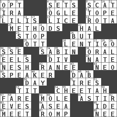 ACROSS 1. Elect 4. Arranges properly for use 8. Get outta here! 12. Lyricist Gershwin 13. Stare at amorously 14. Drink excessively 15. Ms. Damita and namesakes 18. Louse (plural) 19. Round or rotation of duties 20. Modes 22. Actor Linden 23. Obstruct or block passage 24. On the contrary 25. Baseball player Mel 26. Small, flat, pigmented spot on the skin 30. Compass dir. 33. Unit of acoustic absorption 36. Spoken 37. Snakelike fish 39. HTML Container Element 40. Nathan's nickname 41. Soft 42. Indian princess (variant) 44. Modern: prefix 45. Orator 47. Small moist lump or mass 50. 24 hours 51. Angers 53. Teat (slang) 54. Leopard's kin 57. Conductor's collection 59. Undercover agent 61. Having gotten out of bed 63. Nights before holidays 64. Toward the sea 65. Binary compound 66. Rendezvous 67. Frolic 68. Born DOWN 1. Petroleum 2. Demure 3. Stories 4. Disposed of to a purchaser 5. The front part of a cuirass 6. Affectionate concern, for short 7. Observe 8. Ski resort town in Vermont 9. Calm and collected 10. Fitting 11. Beverage made from leaves 16. "Tell ____ the Marines!" 17. Attempt 21. Chooses 22. Attila the _ 24. Benjamin's nick name 26. Not recorded 27. SW Asia republic 28. Yard entry 29. Butter sub 30. Elected reps. 31. Ooze 32. Otherwise 34. The sixth month of the Jewish calendar 35. Storage container 38. Most dark, concealed or hidden 42. Marina Del _, California 43. Singer Brickell 46. Krazy ___ of comics 48. Type of rug 49. Antes 52. Smooth fabric 53. Family _ (genealogy) 54. Clement's nick name 55. Pile 56. Flintstone garb 57. Opposite of masc. 58. "___ Maria" 59. Make imperfect 60. Bear (Spanish) 62. Portuguese money of account (variant)