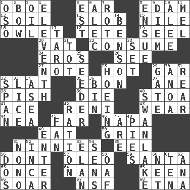 ACROSS 1. Mitch Miller's instrument 5. Ewer handle 8. Dutch treat 12. Earth 13. Messy guy 15. Mediterranean tributary 16. A small or young owl 18. False hair 19. Sew up the eyelids of hawks and falcons 20. Large container 22. Ingest 24. Greek god of love 26. Perceive with the eye 27. Short letter 28. Being at a high temperature 29. Slender fish 32. Narrow board 35. Inky black, to poets 37. A saturated hydrocarbon 38. Expression of disdain 39. Pass on 40. Portico 41. Adept person 42. Painter Guido (1575-1642) 43. Erode 44. Teachers' org. 45. At a great distance 46. California wine valley 49. Ingest 50. Broad smile 51. Fools 55. Snakelike fish 56. Do not 57. Margarine 59. Before Barbara or Clara 63. At one time in the past 64. Grandmother 65. Peachy ____! 66. Fly high 67. Overdraft (abbr.) 68. Inactive volcano in Sicily DOWN 1. Bear (Spanish) 2. Ribbon knot 3. Petroleum 4. Veterans Day date 5. Eastern Standard Time (abbr.) 6. Actor Baldwin 7. Printing process, for short 8. Take place subsequently 9. South Vietnam president (1954) 10. Toward shelter 11. Cartoonist voice _ Blanc 14. Gillaume's butler role 17. Edible starchy tuberous root 21. Small child 23. Arrange properly for use 25. Sowing specialist 28. Weeding 29. Yard entry 30. Small Philippine buffalo 31. Hitchcock's "____ Window" 32. Connect, as a bridge 33. Louse (plural) 34. At sea 36. Storage container 40. Tchaikovsky ballet 42. Food allowance for one day 45. Avid follower 47. "We ___ not amused" (Victoria) 48. Sliced desserts 49. Keyboard key 51. Words to Nanette 52. South American Indian 53. Enthusiasm 54. Elected reps. 56. Two (Sp.) 58. Clumsy lout 60. Remaining after all deductions 61. "___ Little Indians" 62. Santa ___, CA