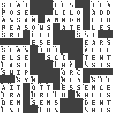 ACROSS 1. Narrow board 5. Raised railways 8. Beverage made from leaves 11. Airs 12. _ and Stitch 14. Find the sum of 15. Indian state 17. ID or VA city 18. Hat (slang) 19. Thinks logically 21. Had dinner 22. French article 23. _ Lanka 24. Allow 25. Fast jet (abbr.) 27. Compass dir. 28. Hearing organs 31. Oceans 35. Three (prefix) 37. Toward shelter 38. Otherwise 39. _-fi 41. Portable shelter 42. Comfort 43. Period 45. Fast planes 46. Clip 47. The grampus (Milton) 49. Symbol (abbr.) 51. Teachers' org. 52. Be seated 55. Small island 57. Baseball player Mel 60. Substance 62. Retirement account (abbr.) 63. A special lineage 65. Leg joints 66. Lair 67. Elected reps. 68. Gouge 69. Eastern Standard Time (abbr.) 70. Begley and Asner 71. Indian titles of respect DOWN 1. Practice fights 2. Failure 3. Slender Brazilian palm 4. Beverages made from leaves 5. Shade tree 6. Pale green bean 7. Narrow opening 8. Baron Munchausen's specialties 9. Singer Brickell 10. Does sums 13. Singles 16. Undercover agent 17. Michaelmas daisies 20. Egg locale 26. Theater features 29. Monthly bill 30. Arranges properly for use 31. Perceives with the eye 32. Flair 33. Aide 34. Oozy 36. Frozen water 40. Pressed 44. Ancient Greek god of war 48. Keg 50. Crowds into 52. Scornful expression 53. Ancient Celtic tribe of eastern Britain 54. Trials 55. Helper 56. Angers 58. Family _ (genealogy) 59. Be inclined (to) 61. Conclusions 64. Curvy letter