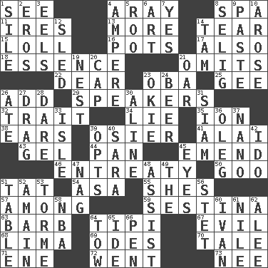 ACROSS 1. Perceive with the eye 4. Like ___ of sunshine 8. Health resort 11. Angers 13. Greater amount 14. Separate forcefully 15. Hang loosely or laxly 16. Plant holders 17. In addition 18. Center 21. Leaves out 22. Letter starter 23. Chief or king in Benin or Nigeria 25. Turn to the right 26. Say or write further 29. Orators 32. Distinguishing feature 34. Untruth 35. Electrically charged atom 38. Hearing organs 39. Flexible twig of a willow tree 41. Jai ____ 43. Set 44. Baking dish 45. Make improvements or corrections to 46. Plea 50. Thick or sticky substance 51. Make lace 54. White ___ sheet 55. "______ My Girl" (Turtles hit) 57. Amid 59. French poetic form 63. Sharp remark 64. Native american tent (variation) 67. Morally bad or wrong 68. Pale green bean 69. Lyric poems 70. Lie 71. Compass dir. 72. Gone 73. Born DOWN 1. Filth; sediment 2. Greek god of love 3. Snakelike fish 4. Electrical Unit 5. Friend of Pooh 6. Nonscientific branch of learning 7. Consenting reply 8. Former Milwaukee Brewers owner Bud 9. Thick mixture 10. Came up 12. Downhill vehicle 14. Scottish cap 19. A home for chicks 20. Head covering 21. Rowing implement 23. Migrant worker of the '30s 24. Fermented drink made from hops 26. Had dinner 27. To trail on the ground 28. Have the gumption 30. Place in a line 31. Thailand, formerly 33. Capri or Wight 36. Cassini of fashion 37. Billionth: prefix 39. Elects 40. "Two Mules for Sister ____" 42. Wedding promise 45. Snake ____ (dice throw) 47. Tired old horse 48. Help 49. Definite Article 51. Eating place 52. With great haste 53. Singer Mel 56. Proofreading order 58. Basketball assoc. 60. _ the terrible 61. Mediterranean tributary 62. Toward shelter 64. Pull behind 65. Binary compound 66. Animal enclosure