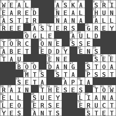 ACROSS 1. Welt 5. "____ silly question..." 9. _ Lanka 12. Having ears or earlike features 14. Actress Patricia 15. Attila the _ 16. Having gotten out of bed 17. Nanny 18. 100% 19. To separate or throw off 20. Michaelmas daisies 23. Jennifer or Joel 24. Stare 25. Old (Scot.) 27. Torque (variant) 30. Single 32. Compass dir. 33. Collude with 34. Whirlpool 36. Followers of ems 38. The 19th letter of the Greek alphabet 39. Compass dir. 40. Perceive with the eye 43. Oct. 31 cry 46. Mild oath, euphamism for damn 48. Portico 49. Mountains (abbr.) 51. R.R. building 52. Inconspicuous attention getter 53. Stalk of a moss capsule 54. Capital of Western Samoa 56. Water falling in drops from the sky 58. College papers 61. Pull behind 64. Pipe bend 65. Chop _ 66. Woody, climbing, usually tropical plant 68. Lion 69. Celtic language 70. Spew [out] 71. Affirmative reply 72. Pismires 73. Proofreading order DOWN 1. Erode 2. Comfort 3. Johnson of "Laugh-In" 4. Flowery wreath 5. Singer Murray 6. Scorch 7. Sunflower state 8. Chicken ___ king 9. Pottery fragment 10. Governing power 11. Inwardly 13. To draw with force 21. _ gin 22. Watched over 23. Small, secluded valley 24. Sep. follower 26. Purpose 27. Make lace 28. Chief or king in Benin or Nigeria 29. Reuben's nickname 31. Ferber et al. 35. Gossips 37. Fast planes 41. Greek goddess of the dawn 42. Consume 44. Sign of things to come 45. Baseball player Mel 47. Yawn 48. Health resort 50. Titan orbits this 53. Grain storage towers 55. Capri or Wight 56. Have trust in 57. Toward shelter 59. Command 60. Snake ____ (dice throw) 61. Tense 62. At one time in the past 63. Electrical Unit 65. Ocean 67. Big collection agency