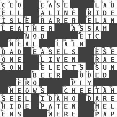 ACROSS 1. Corporate head (abbr.) 4. Comfort 8. Experiment locale 11. Pipe bend 12. Place in a line 14. Travel on an animal 15. Capri or Wight 17. More uncommon 18. Liveliness 19. Cordwainer's material 21. Indian state 23. Allow head to fall sleepily 24. And so on (abbr.) 25. Be tempered by heat 27. (Had) reclined 30. Male parent 31. Artist's stands 34. Compass dir. 37. Single 38. Make or become more lively 39. Actress Charlotte 40. Male offspring 41. Chooses 43. Player for Phoenix 44. Fermented drink made from hops 45. Wrote a lyric poem 47. Away 49. Strand of rope, yarn or thread 50. Catcalls? 52. Leopard's kin 56. Sew up the eyelids of hawks and falcons 57. Potato state 60. Have the gumption 61. Flintstone garb 62. Eucharist need 63. Cartoonist voice _ Blanc 64. Followers of ems 65. Past tense of be (plural) 66. Infant food DOWN 1. To provide with a ceiling 2. Otherwise 3. Rounded earthenware pot or jar 4. Having ears or earlike features 5. Having or resembling wings 6. Title for a knight 7. Compass dir. 8. Pale purple color 9. First of billions? 10. Benjamin's nick name 13. Epoch 14. State of inaction 16. Inactive volcano in Sicily 20. Hollow 22. Elected rep. 25. Billionth: prefix 26. Paradise 27. Crowbar 28. Actor Baldwin 29. Is not 30. Two (Sp.) 32. Toward shelter 33. Filth; sediment 34. Celtic language 35. Saudi Arabian king (1953-1964) 36. Car or cant ending 42. Flatfish 44. Arrow shooter 46. Colored 47. Gives food to 48. Hero or heavy, e.g. 49. Give a jingle 50. Chow _ 51. Small drink 52. "Mermaids" star 53. Pack (down) 54. Type of rug 55. Aid 56. A female animal or person 58. Fool 59. Had dinner