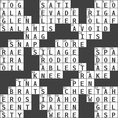 ACROSS 1. Coat; cloak 4. Suttee (variant) 8. Lion 11. Wing 12. Dodge 14. Port city in Latvia 15. Small, secluded valley 17. 61 cubic inches 18. Norwegian king 19. Deli grouping 21. Stay clear from 23. Tired old horse 24. It is 25. Fastener 27. Old wives' tales, e.g. 30. Actress Charlotte 31. Fodder prepared in a silo 34. Health resort 37. Lyricist Gershwin 38. Cowboy competition 39. Spanish title 40. Lubricate 41. Most capable 43. White ___ sheet 44. Leg joint 45. Immoral or dissolute person 47. _ tizzy (2 wds.) 49. Fenced enclosure 50. Naughty children 52. Leopard's kin 56. Greek god of love 57. Potato state 60. Had on 61. Transmitted 62. Eucharist need 63. Set 64. Filthy place 65. Past tense of be (plural) 66. Viper DOWN 1. Labels 2. Water jar 3. Highlander 4. Major League Baseball Commissioner Bud 5. Deliberation 6. Make lace 7. Binary compound 8. Ms. Damita and namesakes 9. Mild oath 10. Clumsy lout 13. Epoch 14. Carrot, for example 16. Grandmother 20. Atlas contents 22. Compete 25. Indian skirt 26. Be tempered by heat 27. Dipping utensil 28. Double curve, resembling the letter S 29. Vintage cars 30. _ de Janeiro 32. SW Asia republic 33. Ear part 34. Neighbor of Neb. 35. Airs 36. Santa ___, CA 42. Woody plant 44. Krazy ___ of comics 46. Afresh 47. Literary sarcasm 48. Political cartoonist Thomas 49. Give a jingle 50. Cy Young winner Saberhagen 51. Small drink 52. "Mermaids" star 53. Ancient Roman robe 54. Ancient Greek god of war 55. Assist 56. Double-curved letter 58. Simpleton 59. Had dinner