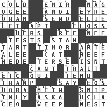 ACROSS 1. Lacking warmth 5. Independent ruler or chieftain 9. Tired old horse 12. Double curve, resembling the letter S 13. Mine, in Marseilles 14. Jane of fiction 15. NW Algerian seaport 16. Post 17. Writer Wiesel 18. Allow 19. Fitting 21. Soft thread for cleaning between teeth 22. Possessive pronoun 24. To separate or throw off 26. Born 27. Trials 28. Thailand, formerly 29. Small pie 30. Southeast Indonesia island 32. Johnson of "Laugh-In" 36. Toward shelter 37. Feline 38. Coral collection 39. Ancient Persian 40. Laconic 42. Is not 43. Patter 44. Distinguishing feature 46. And so on (abbr.) 49. Fr. "Yes" 50. Look after 51. _____ steamer (cargo ship) 53. Declare 54. Greek goddess of the dawn 57. Israeli folk dance 58. Chow _ 61. Sever or remove by pinching or nipping 62. Inwardly 63. "____ silly question..." 64. Southern CA. univ. 65. Corporate head (abbr.) 66. Shed a tear 67. A home for chicks DOWN 1. Calm and collected 2. Legendary monster 3. Resembling or made to resemble leather 4. Lair 5. Compass direction 6. Madame (abbr.) 7. Electrically charged atom 8. To free from 9. Thermoplastic polyamide 10. Originate 11. Honkers 14. Snakelike fish 19. Tate display 20. Inconspicuous attention getter 21. Opposite of masc. 23. First name in cosmetics 24. Debaucheries 25. Ewer handle 27. Lie 28. Don Adams' spy role 29. Scottish cap 31. Ancient Celtic tribe of eastern Britain 32. Believer in; advocate of (suffix) 33. Dwelling 34. Portable shelter 35. Bank Draft (abbr.) 40. The 19th letter of the Greek alphabet 41. Singer James 43. Police officer (slang) 45. Marina Del _, California 46. Moral principle 47. Marketplace scale 48. Monte _, Las Vegas Hotel/Casino 52. Fifth month 53. Fastener 55. Lubricates 56. Petty quarrel 58. Opening into something insatiable 59. Compass dir. 60. Mamie's husband 61. Player for Phoenix