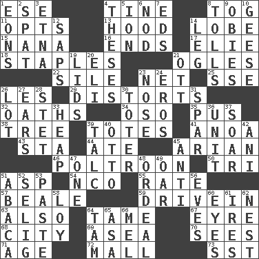 ACROSS 1. Compass dir. 4. Prong on a fork 8. Coat; cloak 11. Chooses 13. Parka part 14. Ear part 15. Nanny 16. Extremities 17. Writer Wiesel 18. Paper fasteners 21. Stares 22. Drop; flow; fall 23. Fish or hair follower 25. Compass dir. 26. French article 29. What propaganda does 32. Profane or obscene expressions 34. Bear (Spanish) 35. Product of festering 38. Relationship diagram 39. Lugs 41. Small Philippine buffalo 43. R.R. building 44. Had dinner 45. Believer in; advocate of (suffix) 46. Characterized by complete cowardliness 50. Three (prefix) 51. Viper 54. Non-commissioned officer (abbr.) 55. Pace 57. Memphis, Tenn. Street 59. Popular '50s hangout 63. In addition 64. Not wild 67. Jane of fiction 68. Municipality 69. Toward the sea 70. Observes 71. Mature 72. Shopping center 73. Fast jet (abbr.) DOWN 1. Immeasurably long periods of time 2. Petty quarrel 3. Inactive volcano in Sicily 4. College papers 5. Electrically charged atom 6. Lower and raise head in agreement 7. Begley and Asner 8. For Whom the Bell _____ 9. Off-Broadway awards 10. Honkers 12. Plant excrements 14. Part of a journey 19. Hats (slang) 20. Biblical high priest 21. Baseball player Mel 23. Olfactory organ 24. Greek god of love 26. Car dealer's back yard 27. Hearing organs 28. Proofreading order 30. Carrier 31. Coast Guard woman 33. Pile 36. A single undivided whole 37. Fly high 39. Baby powder 40. "Beetle Bailey" pooch 42. Black tropical American cuckoo 45. Opposed to 47. Single 48. Severe or trying experience 49. Boat paddle 51. Phillipine bananalike plant 52. Major League Baseball Commissioner Bud 53. Thick mixture 56. Nights before holidays 58. Myrna of the movies 60. Snake ____ (dice throw) 61. Angers 62. A home for chicks 64. Scottish cap 65. White ___ sheet 66. Cartoonist voice _ Blanc