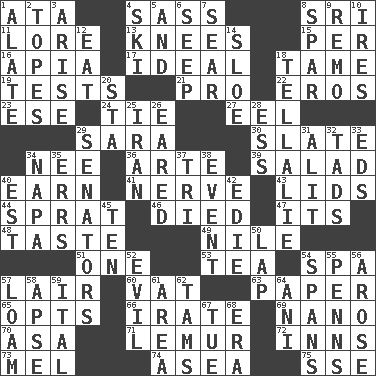 ACROSS 1. "One Day ___ Time" 4. Backtalk 8. Indian title of respect (Mr.) 11. Old wives' tales, e.g. 13. Leg joints 15. For each 16. Capital of Western Samoa 17. Perfect 18. Not wild 19. Trials 21. Adept person 22. Greek god of love 23. Compass dir. 24. Make a knot 27. Snakelike fish 29. "Two Mules for Sister ____" 30. Chalkboard 34. Born 36. Johnson of "Laugh-In" 39. First course 40. Merit 41. Effrontery 43. Hats (slang) 44. Small fatty European fish 46. Passed on 47. It is 48. Clothes sense 49. Mediterranean tributary 51. Single 53. Afternoon social gathering 54. Health resort 57. Den 60. Large container 63. Some stationery 65. Elects 66. Feeling or showing extreme anger 69. Billionth: prefix 70. White ___ sheet 71. Arboreal primate 72. Restaurants 73. Cartoonist voice _ Blanc 74. At sea 75. Compass dir. DOWN 1. Having winglike extensions 2. Drinks excessively 3. Get up 4. What Jean-Claude Killy likes to do 5. Plus 6. Ooze 7. Dry up 8. Coast Guard woman 9. San ____ (Riviera town) 10. Angers 12. Consume 14. _ gin 18. Copy Pinocchio 20. R.R. building 25. SW Asia republic 26. Having ears or earlike features 28. Curvy letter 29. Legislators 31. Set down 32. Small amounts or degrees 33. Begley and Asner 34. California wine valley 35. Blunders 37. Three (prefix) 38. Incident 40. Eastern Standard Time (abbr.) 42. Singer Brickell 45. "___ Little Indians" 50. Infant locale 52. Tending to cause great harm 54. Connects, as a bridge 55. Actor Sean's family 56. Came up 57. Rich soil 58. Domed church section 59. Slanted text style (abbr.) 61. Type of rug 62. Scottish caps 64. Black tropical American cuckoo 67. Third day of the wk. 68. Period