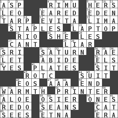 ACROSS 1. Viper 4. Tall New Zealand timber tree 8. Possessive pronoun 12. Lion 13. Having ears or earlike features 14. Locale of original sin 15. Canvas cover 17. Webber/Rice musical 18. Pale green bean 19. Paper fasteners 21. Portable computer 23. River (Sp.) 24. A female animal or person 26. French article 27. Patter 28. One who doesn't tell the truth 30. _ Lanka 31. Titan orbits this 34. Actress Charlotte 37. Allow 38. Remain 39. Raised railways 40. It is so 41. Food holders 42. Be seated 43. College mil. group 44. Set or collection 46. Greek goddess of the dawn 47. Auto club (abbr.) 50. Conclude 51. Heat 54. Hard copy producer 57. Medicinal plant 58. Flexible twig of a willow tree 60. Singles 62. Make new 63. Seines 64. Domesticated feline 65. Perceives with the eye 66. Inactive volcano in Sicily 67. Period DOWN 1. Keyboard modifier key 2. Oceans 3. Likenesses of persons 4. All-night dance parties 5. From or relating to Ireland 6. Was introduced to 7. Freehold land 8. Aide 9. Proofreads 10. San ____ (Riviera town) 11. Fastener 13. Snakelike fish 16. Ache 20. Cooking vessel 22. Actor Alda or Thicke 25. Dodge 27. Algonquian 29. Angers 30. Mischievous 31. Table seasoning 32. Phillipine bananalike plant 33. Teat (slang) 34. Home 35. Came down and settled, as after flight 36. Eastern Standard Time (abbr.) 41. Mail 43. Lover boys 44. Elected rep. 45. To (old English) 46. Wear away 48. Bee-related 49. Sports stadium 51. Armed conflicts 52. Toward shelter 53. Stockings 55. Big collection agency 56. Stern 59. Put into a specified state 61. R.R. building
