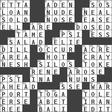 ACROSS 1. Singer James 5. An important port of Yemen 9. Distress signal 12. Grant temporary use of 13. Naked 14. Be tempered by heat 15. Exchanged or delivered for money 16. Characteristic smell of wine 17. Relaxation 18. Pipe bend 19. "We ___ not amused" (Victoria) 21. Administered medicine 22. Docile 24. Air pressure measure (abbr.) 26. Curvy letter 27. Vegetable dish 28. Writer Wiesel 29. Deli pickle 30. Come to pass 32. 1/640 square mile 36. Length times width 37. Being at a high temperature 38. Supercomputer manufacturer 39. Delicate 40. Grain storage towers 42. Casino tip 43. French philosopher Descartes 44. Came up 46. Pacific Standard Time (abbr.) 49. _ tizzy (2 wds.) 50. Religious women 51. Having the leading position 53. Compass dir. 54. Armed conflict 57. Sweet dark-red dessert wine 58. Ancient Roman robe 61. Lacquered or enameled metalware 62. Celtic language 63. Collude with 64. SW Asia republic 65. To sift 66. Indonesian resort city 67. Prepare for publication DOWN 1. Otherwise 2. Implement 3. Baron Munchausen's specialties 4. Also 5. Singer Murray 6. Superhero pair 7. Begley and Asner 8. Born 9. Gospel singer Marvin 10. Fertile tracts in a desert 11. Bobsleighs 14. Modern: prefix 19. Nursemaid (var.) 20. Redecorate 21. Pass on 23. Assad's deity 24. Mickey's pet 25. Title for a knight 27. Male parent of an animal 28. Learning spot: Fr. 29. Daniel's nick name 31. Large country 32. Gambison 33. What you're doing now 34. Immoral or dissolute person 35. Sight organ 40. Elected rep. 41. Without 43. To free from 45. Regret 46. Some stationery 47. Dinah or Pauly 48. Laconic 52. Had dinner 53. Suttee (variant) 55. Jai _ 56. Monthly bill 58. Keyboard key 59. Chief or king in Benin or Nigeria 60. Set 61. Make a knot