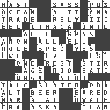 ACROSS 1. Political cartoonist Thomas 5. Backtalk 9. Fluid product of inflammation 12. Sea 14. Came down and settled, as after flight 15. Santa ___, CA 16. Barter 17. Trust 18. One more than two 19. Snakelike fish 20. New York city 23. International (abbr.) 24. Toward shelter 25. Global Positioning Systems (abbr.) 27. At once, immediately (arch.) 30. Everything 32. Pipe bend 33. Hero or heavy, e.g. 34. Moved rapidly 36. Affirmative reply 38. She-sheep 39. First lady 40. Eastern Standard Time (abbr.) 43. Single 46. Remainder 48. Move through with a circular motion 49. Ripen 51. River (Sp.) 52. Suttee (variant) 53. Capital and largest city of Mongolia 54. Narrow opening 56. Baby powder 58. Scheduled 61. Chief or king in Benin or Nigeria 64. Keyboard modifier key 65. Fermented drink made from hops 66. Having ears or earlike features 68. Impair 69. Jai _ 70. A sleeping potion; an opiate (poet.) 71. Epoch 72. "____ silly question..." 73. Liveliness DOWN 1. Musical sound 2. Measure of real estate 3. Lick closed 4. Small amount or degree 5. "Two Mules for Sister ____" 6. Actor Baldwin 7. Fodder prepared in a silo 8. Filthy place 9. Aches 10. A single undivided whole 11. Move on water 13. Famous astronaut Armstrong 21. Beverages made from leaves 22. Assistant 23. Small island 24. One (Scot) 26. Strand of rope, yarn or thread 27. "We ___ not amused" (Victoria) 28. At this time 29. Margarine 31. Crowbar 35. Cease 37. Bristle 41. Be seated 42. Three (prefix) 44. Drug cop 45. Ovum 47. Lacquered or enameled metalware 48. Fast jet (abbr.) 50. Artist's stands 53. Extreme 55. Wrote a lyric poem 56. Not wild 57. Having or resembling wings 59. Path through which fluid escapes 60. Roberta Peters solo 61. Taken by mouth 62. Actor Lugosi 63. Arabian gulf 65. Sound made by sheep 67. Deep reverence