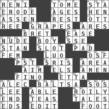 ACROSS 1. Painter Guido (1575-1642) 5. Heavy book 9. R.R. building 12. Eat (away) 14. Matures 15. Layer 16. NE Netherlands city 17. Relief 18. Baseball player Mel 19. To riddle 20. Wine fruits 23. Ancient Greek god of war 24. Cy Young winner Saberhagen 25. Relaxation 27. Naked 30. Male child 32. Compass dir. 33. Comedian Laurel of Laurel & Hardy 34. Slit 36. Groovy apt. 38. Opposite of masc. 39. Nilotic language 40. Order of Saint Francis (abbr.) 43. Pacific Standard Time (abbr.) 46. Indian titles of respect 48. Type of rug 49. Direct toward a target or goal 51. Raised railways 52. So be it 53. Fine (Spanish) 54. Singer James 56. Actor Baldwin 58. Greek mezzo-soprano Agnes 61. Mayday 64. Area sheltered from the wind 65. Competent 66. Turbulent 68. Conclusion 69. Beverages made from leaves 70. Falsehoods 71. Begley and Asner 72. Prepare for publication 73. Lowest support of a structure DOWN 1. Stern 2. Celtic language 3. Characteristic smell of wine 4. Binary compound 5. Canvas cover 6. Double curve, resembling the letter S 7. Makes clutter 8. Eastern Standard Time (abbr.) 9. Dinah or Pauly 10. Wig 11. Pismires 13. Engineer (abbr.) 21. Confederate soldiers (slang) 22. Ringlike coral islands and reefs 23. Toward the sea 24. Benjamin's nick name 26. Cleo's killer 27. Overdraft (abbr.) 28. Shoshoni 29. Moist 31. You are 35. Bathroom 37. Dormintory (informal) 41. Observe 42. Air blower 44. Ketch in the Levant 45. Metal container 47. Fast planes 48. American Automobile Association (abbr.) 50. Crowded into 53. Eats 55. Small pie 56. Toward shelter 57. Grant temporary use of 59. Jai _ 60. For fear that 61. Grain storage tower 62. Margarine 63. System (abbr.) 65. Had dinner 67. Clumsy lout
