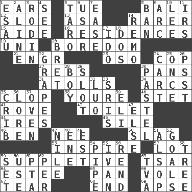 ACROSS 1. Hearing organs 5. Third day of the wk. 8. Indonesian resort city 12. _ gin 13. White ___ sheet 14. Less widely known 15. Assistant 16. Dwellings 19. Single; one (prefix) 20. Mood resulting from idleness 21. Engineer (abbr.) 23. Bear (Spanish) 24. Police officer (slang) 27. Confederate soldiers (slang) 30. Baking dishes 31. Ringlike coral islands and reefs 34. Curves 35. Hoof sound 38. You are 40. Proofreading order 41. Be footloose 42. Bathroom plumbing fixture 44. Angers 45. Filth; sediment 46. Benjamin's nick name 47. Born 50. Volcanic refuse 53. Heighten or intensify 57. Car dealer's back yard 59. Supplying deficiencies 63. Russian ruler of old 64. First name in cosmetics 65. Baking dish 66. Grand slam 67. Pull apart 68. Conclude 69. Domed church section DOWN 1. He sold his birthright 2. Place in a line 3. "The Thinker" sculptor 4. Observe 5. Edible starchy tuberous root 6. One who uses or employs something 7. Relaxation 8. Forbid 9. Curve 10. Area sheltered from the wind 11. Big collection agency 14. San ____ (Riviera town) 17. Wedding promise 18. Two (Sp.) 20. Cy Young winner Saberhagen 22. Wine fruits 24. Heavy open wagon 25. At one time in the past 26. Inconspicuous attention getter 28. Male child 29. Notch 30. Soft color 32. Nilotic language 33. Indian titles of respect 35. Baby bed with high sides 36. Old wives' tales, e.g. 37. Baking chamber 39. Biblical high priest 43. Otherwise 47. "Death on the ____" 48. Compass dir. 49. Eastern Standard Time (abbr.) 51. Columnist Joseph or Stewart 52. Finish lines 54. Corncob 55. _ the terrible 56. Tear apart 58. Woody plant 59. Put into a specified state 60. Purpose 61. Parent Teacher Assoc. 62. For each 63. Federal power corp.
