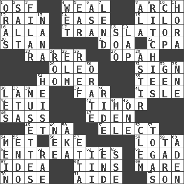 ACROSS 1. Order of Saint Francis (abbr.) 4. Welt 8. Bowlike part 12. Water falling in drops from the sky 14. Relaxation 15. _ and Stitch 16. Silent film actress Nazimova 17. Interpreter 20. Comedian Laurel of Laurel & Hardy 21. ___ good deed 22. Numbers guy (abbr.) 23. Less widely known 27. Brightly colored fish 29. Margarine 31. Omen 34. Baseball hit which scores a run 35. Adolescent 36. Unable to walk 39. At a great distance 41. Capri or Wight 42. Needle case 43. Southeast Indonesia island 46. Backtalk 47. Genesis locale 48. Inactive volcano in Sicily 51. Choose 54. Was introduced to 56. Supplement with great effort 58. Globular water bottle used in Asia 61. Pleas 66. Mild oath 67. The content of cognition 68. Canisters 69. Female horse 70. Olfactory organ 71. Assistant 72. Manchild DOWN 1. Mouths or openings 2. Table seasoning 3. Having threads 4. Dripping 5. Hearing organ 6. White ___ sheet 7. Grant temporary use of 8. Chicken ___ king 9. Actors Guy, Robert Welles, and Clint 10. Hoof sound 11. Israeli folk dance 13. Nanny 18. "Barney Miller" actor Jack 19. Pet locale 24. Friend of Pooh 25. Shade tree 26. Coral ridge 28. Having gotten out of bed 30. Speak pompously 32. Set 33. Compass dir. 34. Robbery 36. French article 37. _ moment's notice (2 wds.) 38. French bagpipes 40. Travel on or in a vehicle 44. Cartoonist voice _ Blanc 45. Single 49. Born 50. Alias (abbr.) 52. Clement's nick name 53. Ancient Roman robes 54. Count _ (2 wds.) 55. Inside; within (prefix) 57. Singer James 59. Edible starchy tuberous root 60. Arabian gulf 62. Actress Charlotte 63. One more than two 64. Conclude 65. Compass dir.