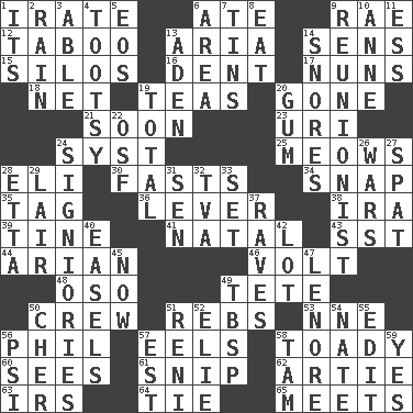 ACROSS 1. Feeling or showing extreme anger 6. Had dinner 9. Actress Charlotte 12. Off limits 13. Operatic vocal solo 14. Elected reps. 15. Grain storage towers 16. Gouge 17. Religious women 18. Fish or hair follower 19. Beverages made from leaves 20. Went 21. Within a short period 23. RI univ. 24. System (abbr.) 25. Catcalls? 28. Biblical high priest 30. Goes without food and/or water 34. Fastener 35. Label 36. Crowbar 38. Lyricist Gershwin 39. Prong on a fork 41. Relating to or accompanying birth 43. Fast jet (abbr.) 44. Believer in; advocate of (suffix) 46. Electrical Unit 48. Bear (Spanish) 49. False hair 50. Group working together 51. Confederate soldiers (slang) 53. Compass dir. 56. Silvers or Donahue 57. Snakelike fish 58. Sycophant 60. Observes 61. Clip 62. Nick name for Arthur 63. Big collection agency 64. Standoff 65. Confronts DOWN 1. It is 2. Precipitation 3. Competent 4. A girl or young woman (variant) 5. Greek goddess of the dawn 6. Length times width 7. Metal containers 8. Consume 9. One who advocates reunion 10. Singer Murray 11. Curvy letter 13. Arabian gulf 14. Sounds asleep 19. Add up to 20. Chewing product 22. Order of Saint Francis (abbr.) 24. Seigniories (variant) 26. Armed conflicts 27. Argument over a trivial matter 28. Singer James 29. Den 31. Elected rep. 32. Federal power corp. 33. Put into a specified state 37. All-night dance parties 40. Artist's stands 42. Car dealer's back yard 45. Immediately 47. Poe poem 49. Cook's measure (abbr.) 50. "Mermaids" star 51. Painter Guido (1575-1642) 52. Writer Wiesel 54. Nathan's nickname 55. Prepare for publication 56. Air pressure measure (abbr.) 57. Eastern Standard Time (abbr.) 58. Scottish cap 59. Affirmative reply