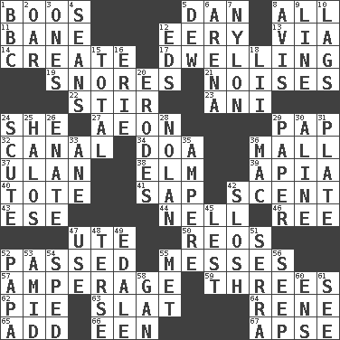 ACROSS 1. Expressions of contempt or scorn 5. Daniel's nick name 8. Everything 11. Object of repulsion 12. Suggestive of the supernatural 13. By way of 14. Make 17. Home 19. Sounds asleep 21. Annoying sounds 22. Use a spoon 23. Black tropical American cuckoo 24. A female animal or person 27. Period of immesurable duration 29. Infant food 32. Lessep's creation 34. ___ good deed 36. Promenade 37. ____ Bator, Mongolia 38. Shade tree 39. Capital of Western Samoa 40. Lug 41. Plant excrement 42. Aroma 43. Compass dir. 44. 1994 drama film starring Jodie Foster 46. To sift 47. Shoshoni 50. Vintage cars 52. Went by 55. Makes clutter 57. Electrical Measurement 59. Threesomes 62. Sliced dessert 63. Narrow board 64. French philosopher Descartes 65. Increase 66. Car or cant ending 67. Domed church section DOWN 1. English channel? 2. Rowing implement 3. Singles 4. Seines 5. Morning condensation 6. Sports stadium 7. Thermoplastic polyamide 8. Advice 9. Actor's bit 10. Falls behind 12. Begley and Asner 15. "_____ Recall" 16. One of the Great Lakes 18. Cards in a Roman deck? 20. Eats (away) 24. Scutum 25. Rings 26. Maternal 28. Pitcher Ryan 29. Some stationery 30. Place in a line 31. Food holder 33. One (Scot) 35. Electrical Unit 36. Big _ 42. Make a splashing sound 45. For fear that 47. Purpose 48. Laconic 49. Peak District village in England 51. Spanish missionary in California 52. Dad 53. Among 54. Hurried 55. Was introduced to 56. Ooze 58. Separate the seeds from cotton 60. Followers of ems 61. Perceive with the eye