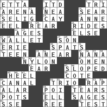 ACROSS 1. Singer James 5. It would 8. Three (prefix) 11. Sports stadium 13. Teachers' org. 14. Wither 15. Former Milwaukee Brewers owner Bud 16. Island 17. Singer Murray 18. Snakelike fish 19. Hitchcock's "____ Window" 21. Amusement-park features 22. Matures 24. Otherwise 25. Place for singles 27. Boy, to dad 29. 4th largest of the Great Lakes 30. Arguments over trivial matters 32. Adolescent 33. Approach 35. Nanny 39. High-strength synthetic material 41. Sign of things to come 42. Ewer handle 43. Slanted 45. The bottom of a shoe or boot 48. ____ d'Azur (French Riviera) 49. Lessep's creation 50. Musical group of three 52. Strike 55. Having or resembling wings 56. Luau course 57. Pulls into pieces 59. Cooking vessels 60. Pipe bend 61. Gurus 62. Compass dir. 63. To separate or throw off 64. Trial DOWN 1. Relaxation 2. Relationship diagram 3. Copy Pinocchio 4. Cuckoo 5. South American Indian 6. Pull apart 7. 24 hours 8. Is inclined (to) 9. Indian princess (variant) 10. Angers 12. Match 14. Move on water 20. Eastern Standard Time (abbr.) 21. Monthly bill 23. American astronaut and politician John 25. Dripping 26. "We ___ not amused" (Victoria) 27. Health resort 28. Rowing implement 30. Elected rep. 31. Snob 33. According to 34. Not either 36. Electrical Measurement 37. Born 38. Plus 40. Shout 43. _-fi 44. Plunders 45. Auras 46. Maternal 47. Hearing organs 49. Smile enhancers 50. Lacquered or enameled metalware 51. Cause heat under the collar 53. Ancient Greek god of war 54. Inconspicuous attention getter 56. For each 58. Consume