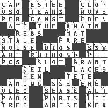 ACROSS 1. Head covering 4. First name in cosmetics 9. Hoof sound 13. Bear (Spanish) 14. Separates forcefully 15. Be footloose 16. For each 17. 2nd pers. sing. pres. of can (arch.) 18. Locale of original sin 19. Had dinner 21. Definite Article 22. With great haste 24. Confederate soldiers (slang) 26. Floor covering 27. Lacking originality or spontaneity 29. Conductor's collection 30. Annoying sound 31. "Vaya con ____" 33. Compass dir. 36. Nonscientific branch of learning 37. Noisy, rowdy, vocal (Spanish) 40. Sliced dessert 41. Personal Computers (abbr.) 42. Notch 43. Let have 45. To provide with a ceiling 47. Shoestrings 48. Layer 49. Wig 50. Amid 52. Compass dir. 54. She-sheep 56. Margarine 57. Gospel singer Marvin 59. Keyboard modifier key 61. Groovy apts. 62. Pieces 63. Falsehood 64. Woody plant 65. Ascend 66. Dry husk or covering DOWN 1. Police officer (slang) 2. At sea 3. Likenesses of persons 4. And so on (abbr.) 5. Theater features 6. Hyperbolic tangent 7. Celtic language 8. Eastern Standard Time (abbr.) 9. Cause to be 10. Farming town in central California 11. Baking chamber 12. Writing instrument 20. Snakelike fish 22. Collect or gather 23. Make imperfect 25. Fermented drink made from hops 27. Fastener 28. Torque (variant) 29. Pick up the tab 31. Deli pickle 32. Wedding promise 33. High altitude stroll 34. Trig term 35. Moistens 38. Exploiting 39. Stare at amorously 44. Pace 45. Elect 46. Car or cant ending 49. Trials 50. Having or resembling wings 51. Ancient Persian 52. Singe 53. Indian skirt 55. Writer Wiesel 56. Elect 57. Health resort 58. Compass dir. 60. John Ritter's dad