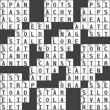 ACROSS 1. Connect, as a bridge 5. Plant holders 9. Air pressure measure (abbr.) 12. Comfort 13. Painful 14. High mountains 15. In addition 16. Detail 17. Welt 18. Luau accessory 19. Car or cant ending 21. Having winglike extensions 22. Exchanged or delivered for money 24. Tired old horse 26. Fast jet (abbr.) 27. Having lost freshness 28. Old wives' tales, e.g. 29. Scram! 30. Annoying sound 32. Torque (variant) 36. Hyperbolic tangent 37. Actress Charlotte 38. At sea 39. Pismires 40. 2nd pers. sing. pres. of can (arch.) 42. Commotion 43. Globular water bottle used in Asia 44. Eroded 46. Eastern Standard Time (abbr.) 49. Had dinner 50. So be it 51. Remove all contents or possession from 53. Mouth or opening 54. Compass dir. 57. Frog relative 58. Play the lead 61. Grain storage tower 62. Writer Wiesel 63. Root beer relative 64. _ the terrible 65. Put into a specified state 66. Slanted text style (abbr.) 67. Confederate soldiers (slang) DOWN 1. Lick closed 2. Light colored 3. Aide 4. Modern: prefix 5. Ache 6. Sep. follower 7. Definite Article 8. Symbol (abbr.) 9. Entreaties 10. Arguments over trivial matters 11. Small island 14. Leather borer 19. Pipe bend 20. Locale of original sin 21. Grow older 23. Curses 24. Olfactory organs 25. "We ___ not amused" (Victoria) 27. Examine hastily 28. Woody, climbing, usually tropical plant 29. R.R. building 31. Declaim 32. Clothes sense 33. Clearly or manifestly demonstrative 34. It's straight from the horse's mouth 35. Automobile 40. Small bed 41. Pull into pieces 43. Infant locale 45. Housemaid (var.) 46. _____ Park, CO 47. Took without asking 48. Distinguishing feature 52. Binary compound 53. Spoken 55. Broad, flat, thick piece 56. Immeasurably long periods of time 58. _-fi 59. Small child 60. In the manner of 61. Title for a knight