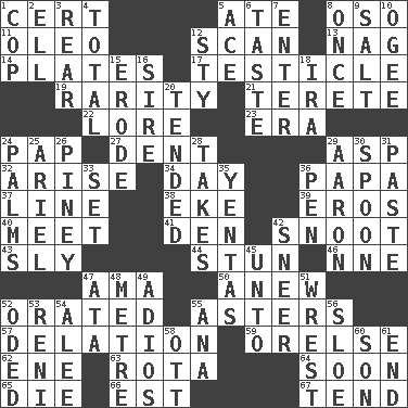 ACROSS 1. Sure thing 5. Had dinner 8. Bear (Spanish) 11. Butter sub 12. Examine hastily 13. Tired old horse 14. Food holders 17. One of the two male reproductive glands 19. Noteworthy scarcity 21. Cigar-shaped 22. Old wives' tales, e.g. 23. Period 24. Infant food 27. Undesirable depression on a surface 29. Viper 32. Originate 34. 24 hours 36. Dad 37. Actor's bit 38. Supplement with great effort 39. Greek god of love 40. Rendezvous 41. Lair 42. Snob 43. Playfully artful 44. Astound 46. Compass dir. 47. Nursemaid (var.) 50. Afresh 52. Spoke pompously 55. Michaelmas daisies 57. Accusation by an informer 59. Threatening words 62. Compass dir. 63. Round or rotation of duties 64. Within a short period 65. Pass on 66. Eastern Standard Time (abbr.) 67. Watch over DOWN 1. Police officer (slang) 2. Pipe bend 3. Stern 4. "_____ Recall" 5. Adept person 6. Clothes sense 7. Keyboard key 8. At one time in the past 9. Table seasoning 10. Double curve, resembling the letter S 12. Filthy place 15. Wear away 16. Father 18. Lyricist Gershwin 20. Watched over 24. Insides of hands 25. Satellite of Uranus 26. Abounding in pines 28. Proceeds 29. Composer Copland 30. Soup utensil 31. Thick mixture 33. Arrange properly for use 35. Gossips 36. Writing instrument 42. Contemptuous expression 45. To (old English) 47. "One Day ___ Time" 48. Distance measurement (Brit.) 49. Goodbye (Sp.) 51. Obtain by seizing forcibly or violently 52. Wrote a lyric poem 53. Painter Guido (1575-1642) 54. Toward shelter 55. Santa ___, CA 56. _ gin 58. Baseball player Mel 60. Boy, to dad 61. Conclusion