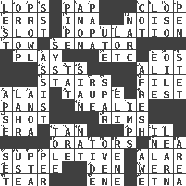 ACROSS 1. Chops off 5. Infant food 8. Hoof sound 12. Blunders 13. _ tizzy (2 wds.) 14. Annoying sound 15. Position in a hierarchy or organization 16. Census information 19. Pull behind 20. Elected representative 21. Shaw product 23. And so on (abbr.) 24. Greek goddess of the dawn 27. Fast planes 30. Set down 31. Flight of steps 34. Do some clerical work 35. Jai _ 38. Grayish beige 40. Repose 41. Zero-star reviews 42. Ear of corn 44. Guess 45. Basketball hoops 46. Period 47. Scottish cap 50. Silvers or Donahue 53. Speakers 57. Teachers' org. 59. Supplying deficiencies 63. Having or resembling wings 64. First name in cosmetics 65. Lair 66. Past tense of be (plural) 67. Lacerate 68. Compass dir. 69. Inactive volcano in Sicily DOWN 1. For fear that 2. Fourth or lowest deck 3. Move like a hungry wolf 4. Fast jet (abbr.) 5. Corncob 6. At once, immediately (arch.) 7. Dad 8. Small bed 9. Cards in a Roman deck? 10. Bear (Spanish) 11. Writing instrument 14. Drug cop 17. Shoshoni 18. Car dealer's back yard 20. System (abbr.) 22. Help 24. Writer Wiesel 25. Lubricates 26. Proofreading order 28. Make lace 29. Thailand, formerly 30. Anew 32. Sorrow 33. Coast Guard woman 35. Domed church section 36. Cowardly lion portrayer 37. Small Philippine buffalo 39. Biblical high priest 43. Naughty children 47. Lacquered or enameled metalware 48. "We ___ not amused" (Victoria) 49. Floor covering 51. An arm off of a larger body of water 52. Memorize 54. Periodic rise and fall of the sea level 55. Baking chamber 56. French philosopher Descartes 58. Type of rug 59. Put into a specified state 60. Purpose 61. Parent Teacher Association (abbr.) 62. For each 63. Deep reverence