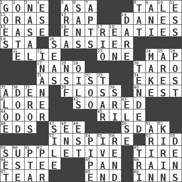 ACROSS 1. Went 5. White ___ sheet 8. Falsehood 12. Mouths or openings 13. Hit sharply and swiftly 14. Natives or inhabitants of Denmark 15. Comfort 16. Pleas 19. R.R. building 20. More impudent 21. Writer Wiesel 23. Single 24. Atlas unit 27. Billionth: prefix 30. Edible starchy tuberous root 31. Help 34. Supplements with great effort 35. An important port of Yemen 38. Soft thread for cleaning between teeth 40. A home for chicks 41. Old wives' tales, e.g. 42. Flew 44. Scent 45. Cause heat under the collar 46. Begley and Asner 47. Perceive with the eye 50. Neighbor of Neb. 53. Motivate 57. To free from 59. Supplementary 63. Hoop that covers a wheel 64. First name in cosmetics 65. Baking dish 66. Water falling in drops from the sky 67. Separate forcefully 68. Conclude 69. Restaurants DOWN 1. Moves 2. Speak pompously 3. Relating to the nose 4. Compass dir. 5. Length times width 6. Without 7. Flats, for short 8. Make lace 9. Cuckoo 10. Area sheltered from the wind 11. Double-curved letter 14. Have the gumption 17. River (Sp.) 18. Car or cant ending 20. Oceans 22. More empty; more void 24. Create 25. Ancient Greek god of war 26. Mail 28. Overdraft (abbr.) 29. Lubricates 30. Looked after 32. "Barney Miller" actor Jack 33. Russian ruler of old 35. Medicinal plant 36. Texas town _ City 37. Greek god of love 39. Indian title of respect (Mr.) 43. Otherwise 47. Drop; flow; fall 48. Compass dir. 49. Eastern Standard Time (abbr.) 51. Believer in; advocate of (suffix) 52. Japanese brewing company 54. Corncob 55. "Terrible" tsar 56. Tear apart 58. Hiding places for outlaws 59. Put into a specified state 60. Purpose 61. Parent Teacher Assoc. 62. For each 63. Three (prefix)
