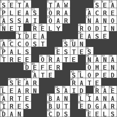 ACROSS 1. Stalk of a moss capsule 5. The 23rd letter of the Hebrew alphabet 8. Ocean 11. Entreaties 13. Mouth or opening 14. Measure of real estate 15. Slender Brazilian palm 16. Rowing implement 17. Billionth: prefix 18. Fish or hair follower 19. Have trust in 21. "The Thinker" sculptor 22. It may be bright or harebrained 24. Comfort 25. Buttonhole 27. Player for Phoenix 29. Friends 30. _____ Park, CO 32. Family _ (genealogy) 33. Speak pompously 35. Grandmother 39. Postpone 41. Sign of something about to happen 42. Had dinner 43. Slanted 45. Dry up 48. Pace 49. Memorize 50. Alleged 52. Actress Charlotte 55. Johnson of "Laugh-In" 56. Prohibit 57. Woody, climbing, usually tropical plant 59. Angers 60. On the contrary 61. _ Allan Poe 62. Daniel's nick name 63. Music discs 64. Snakelike fish DOWN 1. Connect, as a bridge 2. Otherwise 3. One of the two male reproductive glands 4. American Automobile Association (abbr.) 5. Instrument 6. Like ___ of sunshine 7. Armed conflict 8. Large numbers or amounts 9. Bert's buddy 10. Period of immesurable duration 12. Fathers 14. Small Philippine buffalo 20. Ingest 21. French philosopher Descartes 23. Administered medicine 25. Fitting 26. 4-wheeled motor vehicle 27. Fast jet (abbr.) 28. Shoshoni 30. Hearing organ 31. Snout, nose 33. Often (poetically) 34. To sift 36. Electrical Measurement 37. Born 38. Also 40. Merit 43. _ Lanka 44. Dipping utensil 45. Spanish missionary in California 46. Consumed 47. Ancient Greek god of war 49. Put down 50. Saudi Arabian king (1953-1964) 51. Pismires 53. Of or related to the anus 54. Hearing organs 56. English channel? 58. Binary compound