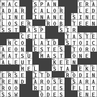 ACROSS 1. Apple computer (short form) 4. Connect, as a bridge 8. Period 11. The sixth month of the Jewish calendar 13. Bodily heat indicating an inflammation 15. Directed 16. Actor's bit 17. Empty; void 18. Trig term 19. Failure 21. Director Reiner 22. Adolescent 23. Fast jet (abbr.) 24. Cleo's killer 27. Title for a knight 29. To provide with a ceiling 30. Clothes sense 34. Non-commissioned officer (abbr.) 36. Put down 39. Unemotional 40. A really long time 41. _____ Park, CO 43. "Corrida" creature 44. Taiwanese island in East China Sea 46. Vertical spar for supporting sails 47. Single 48. Native American of Southwest Alaska 49. Peachy ____! 51. Cartoonist voice _ Blanc 53. R.R. building 54. Make supply last 57. Celtic language 60. It would 63. "The Thinker" sculptor 65. Tear apart 66. Came up 69. "Two Mules for Sister ____" 70. Friend of Pooh 71. Amusement-park features 72. Sudden quick movement 73. Compass dir. 74. Lyric poems 75. Compass dir. DOWN 1. Promenades 2. Goodbye (Sp.) 3. 2nd pers. sing. pres. of can (arch.) 4. _-fi 5. Baking dish 6. Having or resembling wings 7. Words to Nanette 8. Writer Wiesel 9. French philosopher Descartes 10. Arabian gulf 12. Portuguese money of account (variant) 14. Confederate soldiers (slang) 18. Ski resort town in Vermont 20. Actress Charlotte 25. Filth; sediment 26. Suffix with ecto or cyto 28. It is 29. Eaten 31. Within a short period 32. Hoop that covers a wheel 33. Environmental prefix 34. Actress Patricia 35. ____ d'Azur (French Riviera) 37. Call ___ day 38. Writing tables 40. Housemaid (var.) 42. Proofreading order 45. Shoshoni 50. Hearing organ 52. One who doesn't tell the truth 54. Peak District village in England 55. Japanese brewing company 56. Maternal 57. Blunders 58. Vintage cars 59. Frozen precipitation 61. Musical group of three 62. Texas town _ City 64. Order of Saint Francis (abbr.) 67. Perceive with the eye 68. Double-curved letter