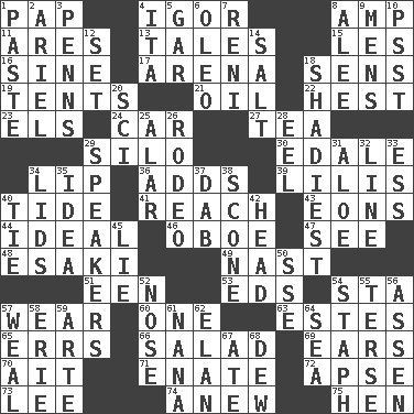 ACROSS 1. Infant food 4. Russian composer Stravinsky 8. Electrical Unit 11. Ancient Greek god of war 13. Falsehoods 15. French article 16. Trig term 17. Sports stadium 18. Elected reps. 19. Portable shelters 21. Lubricate 22. Command 23. Raised railways 24. Automobile 27. Afternoon social gathering 29. Grain storage tower 30. Peak District village in England 34. Mouth edge 36. Sums up 39. Ms. Damita and namesakes 40. Event that recurs at intervals 41. Arrive at 43. Immeasurably long periods of time 44. Standard of perfection 46. Mitch Miller's instrument 47. Observe 48. 1973 Nobel Price Winner (Physics) Leo 49. Political cartoonist Thomas 51. Car or cant ending 53. Begley and Asner 54. R.R. building 57. Erode 60. Single 63. _____ Park, CO 65. Blunders 66. Vegetable dish 69. Hearing organs 70. Small island 71. Related on the mother's side 72. Domed church section 73. Area sheltered from the wind 74. Afresh 75. Layer DOWN 1. Thick mixture 2. Satellite of Uranus 3. Actor Sean's family 4. Call ___ day 5. Slender fish 6. Margarine 7. Painter Guido (1575-1642) 8. Toward shelter 9. Not women's 10. Inconspicuous attention getter 12. Arrange properly for use 14. Table seasoning 18. Most dubious of character or honesty 20. _-fi 25. Having or resembling wings 26. Cowboy competition 28. Snakelike fish 29. Orators 31. Medicinal plant 32. Actor's bit 33. Curvy letter 34. Flaplike coverings 35. The main thing one is thinking about 37. Small moist lump or mass 38. Biscuitlike quick bread 40. Standoff 42. Froth on beer 45. Falsehood 50. Compass dir. 52. Characteristic smell of wine 54. Staphylococcus 55. Laconic 56. NE Netherlands city 57. Welt 58. One of the Great Lakes 59. Johnson of "Laugh-In" 61. Grandmother 62. Enthusiasm 64. Ocean 67. Had dinner 68. Morning condensation