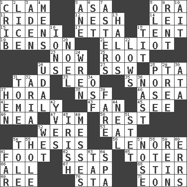 ACROSS 1. Dollar (slang) 5. White ___ sheet 8. Mouth or opening 11. Travel on an animal 12. Tender 14. Flowery wreath 15. Ancient Celtic tribe of eastern Britain 17. Singer James 18. Portable shelter 19. Gillaume's butler role 21. American author Paul (1891-1958) 23. Immediately 25. Carrot, for example 26. One who uses or employs something 27. Compass dir. 28. Parent Teacher Association (abbr.) 31. Small boy 33. Lion 35. Derisive sound 37. Israeli folk dance 38. Overdraft (abbr.) 40. Toward the sea 41. Poet Dickinson 43. Air blower 45. Observe 46. Teachers' org. 47. Zeal 50. State of inaction 52. We are 53. Consume 54. College paper 56. Poe poem 61. One third of a yard 62. Fast planes 65. Carrier 66. 100% 67. Pile 68. Use a spoon 69. To separate or throw off 70. R.R. building 71. Immeasurably long periods of time DOWN 1. Baby bed with high sides 2. Louse (plural) 3. An important port of Yemen 4. Not women's 5. One (Scot) 6. Put into a specified state 7. Michaelmas daisies 8. Butter sub 9. Monthly bill 10. Small island 13. Saint headwear 16. Charged atoms 18. Teat (slang) 20. Christmas carol 22. Moos 24. Songbird 26. Allodial 28. Introduce or present, as a question 29. Family _ (genealogy) 30. _ moment's notice (2 wds.) 31. Heavy book 32. Operatic vocal solo 34. Order of Saint Francis (abbr.) 36. Political cartoonist Thomas 37. Layer 39. Conductor's collection 42. Jacques Cousteau's middle name 44. Actress Patricia 48. From or relating to Ireland 49. Makes clutter 51. Proofreading order 52. Dripping 54. Lacquered or enameled metalware 55. Hollow 57. Olfactory organ 58. Von Bismarck 59. It's straight from the horse's mouth 60. Blunders 61. At a great distance 63. Make lace 64. Health resort