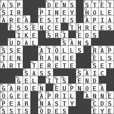 ACROSS 1. Cleo's killer 4. Habitations of wild animals 8. Proofreading order 12. Title for a knight 13. Abounding in pines 14. Opening into or through something 15. Length times width 17. _____ Park, CO 18. Capital of Western Samoa 19. Substance 21. Trios 23. D.D.E's nickname 24. _ Lanka 26. Begley and Asner 27. Allodial 28. Without 30. Compass dir. 31. Ringlike coral islands and reefs 34. Reproach for some lapse or misdeed 37. Nine, plus one 38. The wife of a rajah (variant) 39. Raised railways 40. Tate display 41. Cigar-shaped 42. Arrange properly for use 43. Backtalk 44. Ketch in the Levant 46. Set 47. ___ a Wonderful Life 50. Conclude 51. Place where plants grow 54. Normal relaxed breathing 57. Double curve, resembling the letter S 58. Showery time 60. Queen of England 1702-14 62. Lightbulb-shaped fruit 63. Difficult 64. Music discs 65. Fast planes 66. Lyric poems 67. Sight organ DOWN 1. White ___ sheet 2. The founder of a family 3. Elected leader of a country 4. Flat circles 5. Keyboard key 6. Born 7. System (abbr.) 8. Broken pieces 9. Drinks excessively 10. Writer Wiesel 11. Afternoon social gatherings 13. Animal enclosure 16. "____ silly question..." 20. Snakelike fish 22. Coop moms 25. Small island 27. One who uses or employs something 29. Toward shelter 30. R.R. building 31. Ancient Greek god of war 32. Tarsus (plural) 33. Single 34. Dwelling 35. Actor Baldwin 36. Pacific Standard Time (abbr.) 41. Lie 43. Spring feasts 44. Elected rep. 45. Small Philippine buffalo 46. Relatively large 48. Laconic 49. Sets of matching outer garments 51. Republicans 52. Grows older 53. Billionth: prefix 55. Travel a route regularly 56. "60 Minutes" Commentator Rooney 59. Groovy apt. 61. Compass dir.