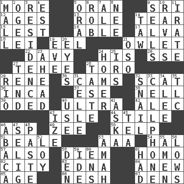 ACROSS 1. Greater amount 5. Northwest Algerian city 9. _ Lanka 12. Matures 13. Hero or heavy, e.g. 14. Pull apart 15. For fear that 16. Competent 17. Inventor's middle name 18. Flowery wreath 19. Snakelike fish 21. A small or young owl 22. American folk hero Crockett 24. Part of HMS, perhaps 26. Compass dir. 27. Giggle 28. "Corrida" creature 29. French philosopher Descartes 30. Fraudulent business schemes 32. Get outta here! 36. South American Indian 37. Compass dir. 38. 1994 drama film starring Jodie Foster 39. Wrote a lyric poem 40. Extremist 42. Actor Baldwin 43. Small island 44. Vertical member of a panel or frame 46. Cleo's killer 49. Last letter of the English alphabet 50. Seaweed 51. Calif. Air Force Base 53. American Automobile Association (abbr.) 54. Actor Linden 57. In addition 58. South Vietnam president (1954) 61. Like (prefix) 62. Municipality 63. Pulitzer Prize-winning author Ferber 64. Afresh 65. Personal question 66. Tender 67. Lairs DOWN 1. Promenade 2. Double curve, resembling the letter S 3. Home 4. Eastern Standard Time (abbr.) 5. Relating to the mouth 6. Director Reiner 7. Everything 8. Born 9. Makes a sale 10. All-night dance parties 11. Feeling or showing extreme anger 14. The 23rd letter of the Hebrew alphabet 19. Night before a holiday 20. Sight organs 21. Bear (Spanish) 23. Forward in time 24. Home run 25. Big collection agency 27. Look after 28. Clothes sense 29. _ de Janeiro 31. Cell (Danish) 32. Slow-paced one 33. Portable communications device 34. Toward shelter 35. Affectionate concern, for short 40. Purpose 41. "____ silly question..." 43. Ending with capital 45. Afternoon social gathering 46. Phillipine bananalike plant 47. Major League Baseball Commissioner Bud 48. Thick mixture 52. Myrna of the movies 53. Nursemaid 55. So be it 56. Coldest temperatures 58. Lair 59. Binary compound 60. Followers of ems 61. Possessed