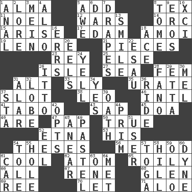 ACROSS 1. _ mater 5. Find the sum of 8. John Ritter's dad 11. Christmas carol 12. Armed conflicts 14. The grampus (Milton) 15. Originate 17. Dutch treat 18. Mine, in Marseilles 19. Poe poem 21. Components 23. Marina Del _, California 25. Otherwise 26. Capri or Wight 27. Ocean 28. Opposite of masc. 31. The first octave above the treble staff 33. Playfully artful 35. A salt of uric acid 37. Narrow, elongated depression 38. Lion 40. International (abbr.) 41. Off limits 43. Plant excrement 45. ___ good deed 46. "We ___ not amused" (Victoria) 47. Infant food 50. Loyal 52. Inactive volcano in Sicily 53. Part of HMS, perhaps 54. College papers 56. Mode 61. Calm and collected 62. Smallest unit of an element 65. Turbulent 66. 100% 67. French philosopher Descartes 68. Small, secluded valley 69. To separate or throw off 70. Allow 71. _ vera DOWN 1. Of or related to the anus 2. Old wives' tales, e.g. 3. Chow _ 4. In addition 5. Deep reverence 6. Male parent 7. Window treatments 8. Heavy book 9. Greek god of love 10. One more than ninety 13. Grin 16. Blunders 18. Adept person 20. Snakelike fish 22. Son of Isaac 24. Shout 26. "Tell ____ the Marines!" 28. Papal veil 29. Singer James 30. Cartoonist voice _ Blanc 31. Having or resembling wings 32. Ear part 34. Affirmative reply 36. Travel on an animal 37. R.R. building 39. Pledge 42. Elects 44. Demure 48. Approach 49. Soft color 51. One who uses or employs something 52. Snakelike fish 54. Lacquered or enameled metalware 55. Hollow 57. Ancient Roman robe 58. Land elevation 59. Butter sub 60. Unit of force 61. Auto 63. Single 64. Was introduced to