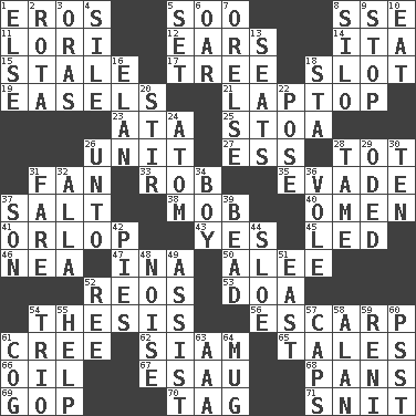 ACROSS 1. Greek god of love 5. "Barney Miller" actor Jack 8. Compass dir. 11. Australian parrot (variant) 12. Hearing organs 14. Call ___ day 15. Having lost freshness 17. Family _ (genealogy) 18. Narrow opening 19. Artist's stands 21. Portable computer 23. "One Day ___ Time" 25. Portico 26. A single undivided whole 27. Double-curved letter 28. Small child 31. Avid follower 33. Director Reiner 35. Dodge 37. Table seasoning 38. Disorderly crowd 40. Presage 41. Lowest deck of a ship 43. Consenting reply 45. Directed 46. Teachers' org. 47. _ tizzy (2 wds.) 50. Toward shelter 52. Vintage cars 53. ___ good deed 54. College paper 56. Fortification 61. Algonquian 62. Thailand, formerly 65. Lies 66. Petroleum 67. Son of Isaac 68. Baking dishes 69. Republican Party 70. Label 71. In a ____ (agitated or irritated) DOWN 1. Otherwise 2. Roll call or roster of names 3. Mouths or openings 4. Filth; sediment 5. Put into a specified state 6. Rowing implement 7. Threatening words 8. Grain storage tower 9. Constrict 10. Ingest 13. Theater features 16. Style 18. R.R. building 20. Disorderly outburst 22. Introduce or present, as a question 24. Smallest unit of an element 26. To (old English) 28. Docile 29. Wrote a lyric poem 30. "___ Little Indians" 31. Conductor's collection 32. Silent film actress Nazimova 34. Male child 36. Grand slam 37. Manchild 39. Necklace unit 42. Sliced desserts 44. _ gin 48. Annoying sound 49. Help 51. Compass direction 52. To separate or throw off 54. Musical group of three 55. Assist 57. Smile enhancers 58. ____ Jay Lerner 59. Painter Guido (1575-1642) 60. Inconspicuous attention getter 61. Gear tooth 63. American Automobile Association (abbr.) 64. Java container