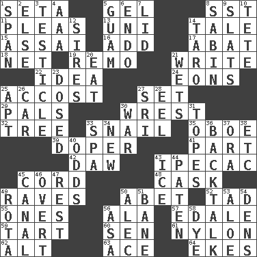 ACROSS 1. Stalk of a moss capsule 5. Set 8. Fast jet (abbr.) 11. Entreaties 13. University (slang) 14. Falsehood 15. Slender Brazilian palm 16. Find the sum of 17. Blind as ____ 18. Remaining after all deductions 19. San ____ (Riviera town) 21. Compose 22. It may be bright or harebrained 24. Immeasurably long periods of time 25. Buttonhole 27. Put into a specified state 29. Friends 30. Take or capture by force 32. Relationship diagram 33. Slow-paced one 35. Mitch Miller's instrument 39. Drug addict 41. Role in a play 42. Obsolete 43. Medicinal drug used to evoke vomiting 45. Drawstring 48. Keg 49. All-night dance parties 50. Collude with 52. Small amount or degree 55. Washington bills 56. Insect wing 57. Peak District village in England 59. Small pie 60. Elected rep. 61. High-strength synthetic material 62. The first octave above the treble staff 63. Adept person 64. Makes supply last DOWN 1. Connect, as a bridge 2. Otherwise 3. One of the two male reproductive glands 4. Auto club (abbr.) 5. Island territory of the United States 6. Inside; within (prefix) 7. Flaplike covering 8. Unit of acoustic absorption 9. Narrow boards 10. Wig 12. Fathers 14. Pacific island yam 20. Erode 21. Soaks 23. Administered medicine 25. Fitting 26. Auto 27. _ Lanka 28. Snakelike fish 30. Armed conflict 31. Drinks excessively 33. Health resort 34. ___ Haven, CT 36. Sass 37. Mouth or opening 38. And so on (abbr.) 40. Probability 43. Frozen water 44. Eucharist need 45. Lessep's creation 46. Unconcealed 47. State of inaction 49. Roll call or roster of names 50. Actor Baldwin 51. Object of repulsion 53. Medicinal plant 54. Cub Scout units 56. White ___ sheet 58. Color